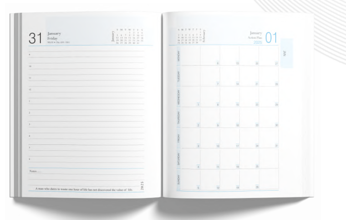 Stylish and functional, this A5-sized diary (148x212 mm) brings a splash of colour to professional planning. It offers 400 pages of 60 GSM natural paper, organized in a dual-colour corporate format. A special highlight is the dedicated page for Sundays, along with a month indicator for easy navigation. The hardbound cover with matte lamination and Crystal UV coating adds durability and visual appeal, perfect for daily use in dynamic work environments.