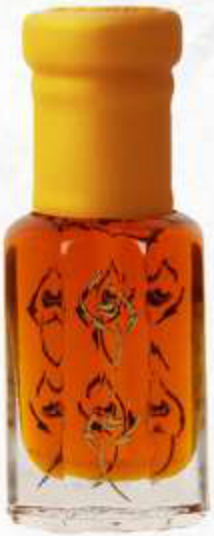 This perfume oil comes in a decorative glass bottle with a vibrant yellow cap. The amber-colored oil features a floral motif etched onto the glass, suggesting a rich and alluring scent. Perfect for personal use or as a thoughtful gift.