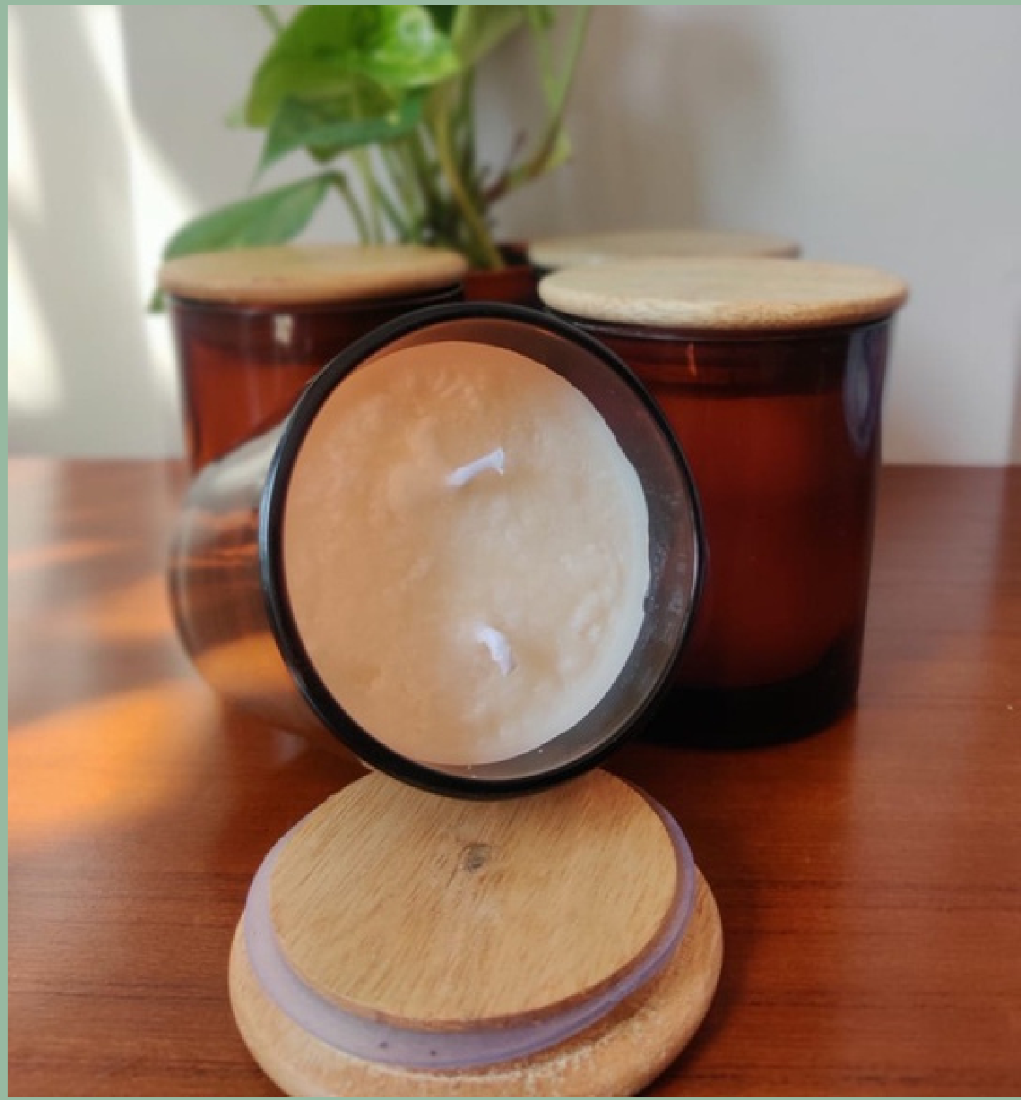 Features: Scented, Wooden Lid, Amber Glass Jar