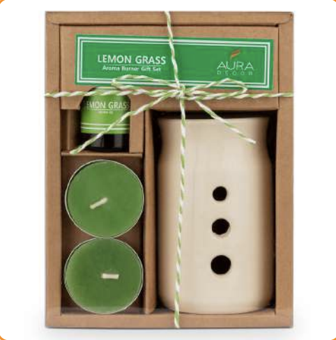 Size : Large ( Burner Size 5inch * 2.5 inch ) Content : 1 Ceramic Burner, 2 Tealights &10ml Aroma Oil Fragrances Available : Lemongrass, Jasmine , Lavender