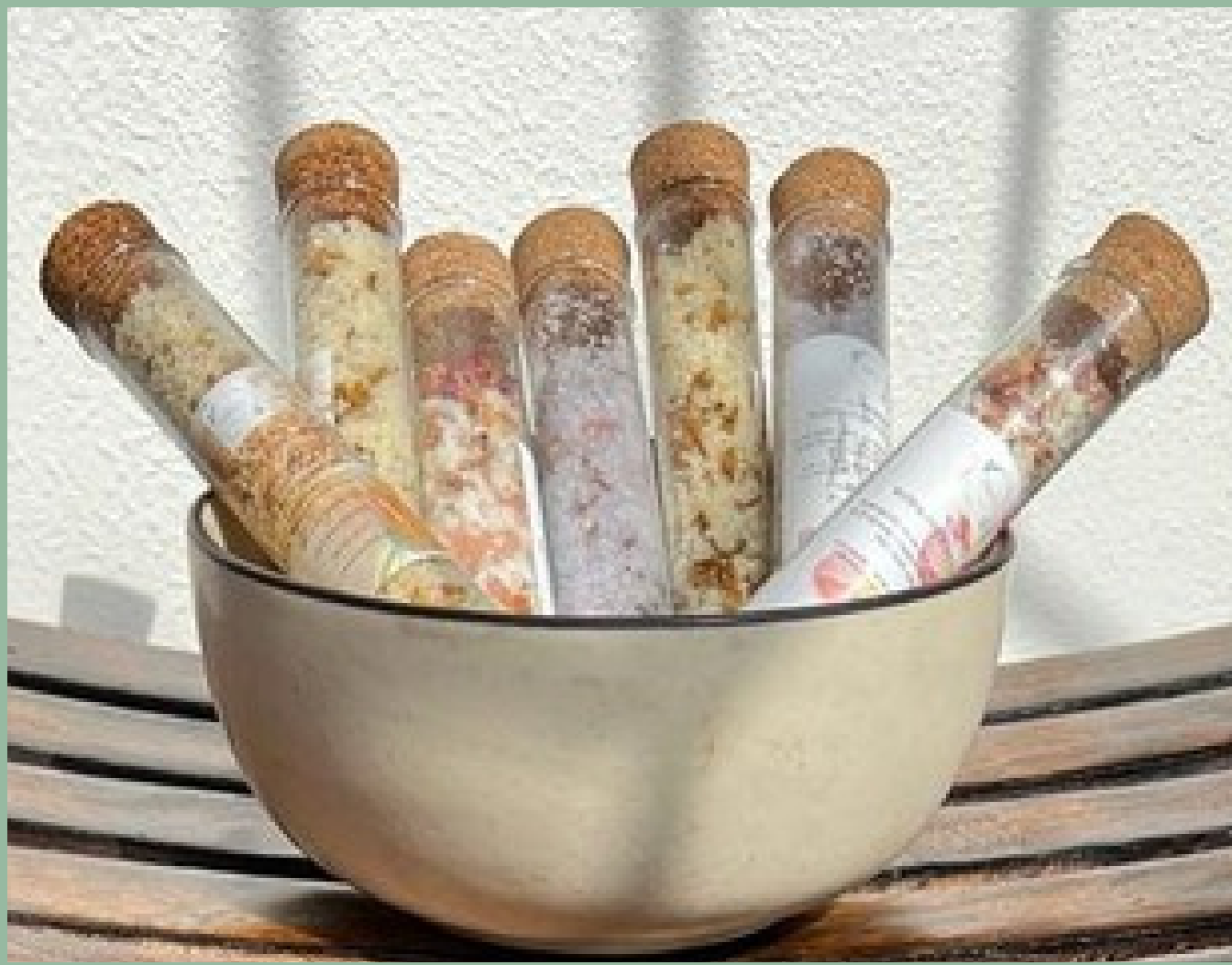 Experience a variety of luxurious bath salts, each uniquely blended with natural ingredients and botanicals. Presented in elegant glass vials with cork stoppers, this sampler set offers a sensory journey for ultimate relaxation and rejuvenation.