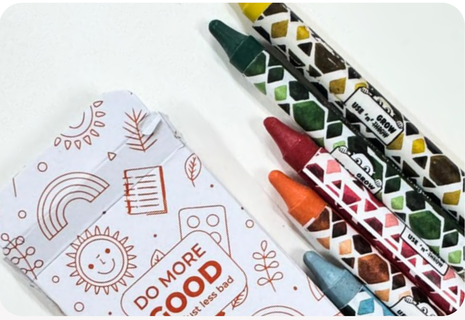 A set of vibrantly colored crayons featuring unique artistic patterns on their wrappers. The accompanying packaging is adorned with cheerful illustrations and an inspiring message, making it perfect for creative expression and thoughtful gifting.