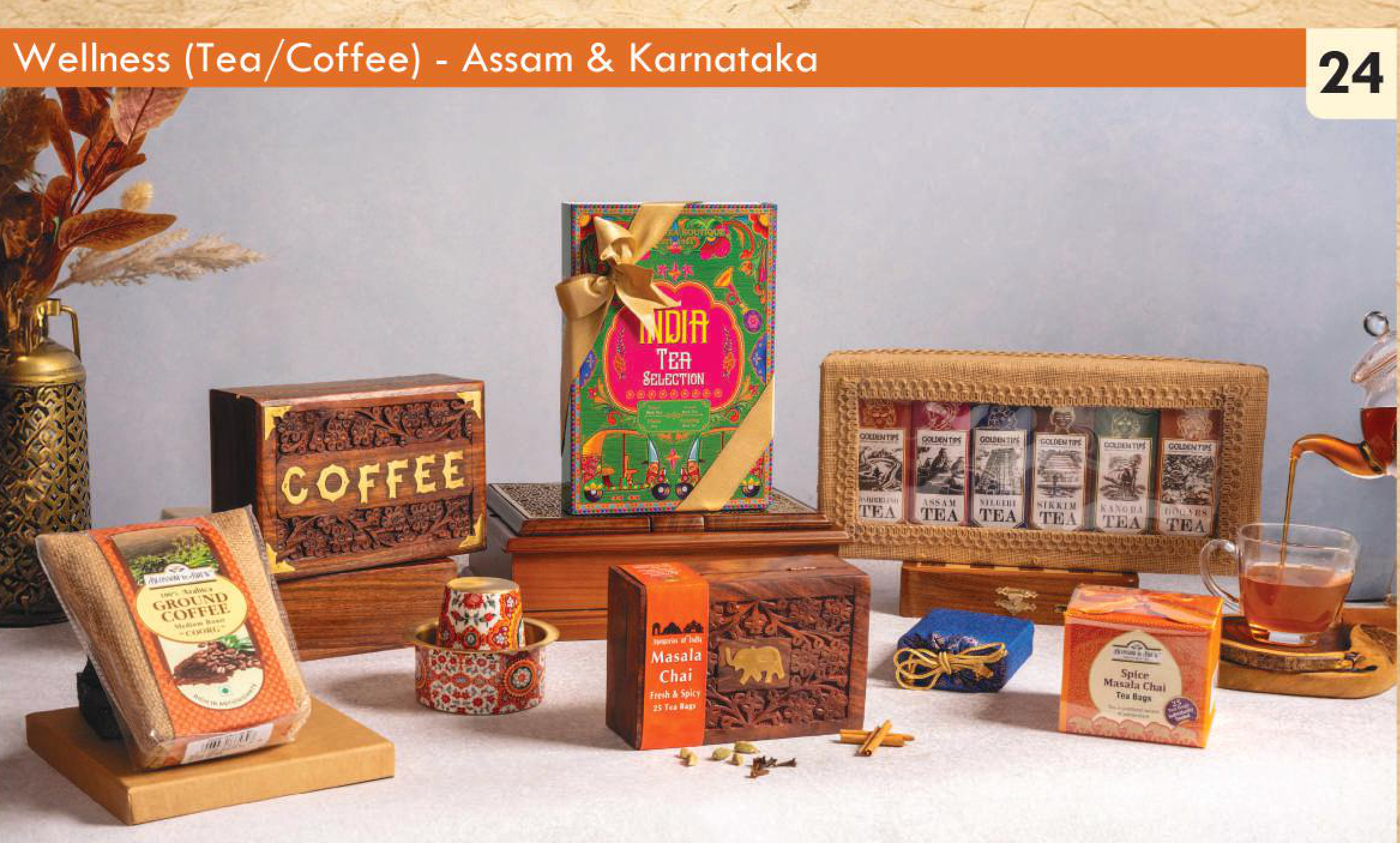 Features: Assorted Teas, Ground Coffee, Decorative Wooden Boxes, Gift Packaging, Assam Tea, Karnataka Coffee, Masala Chai, Spice Masala Chai