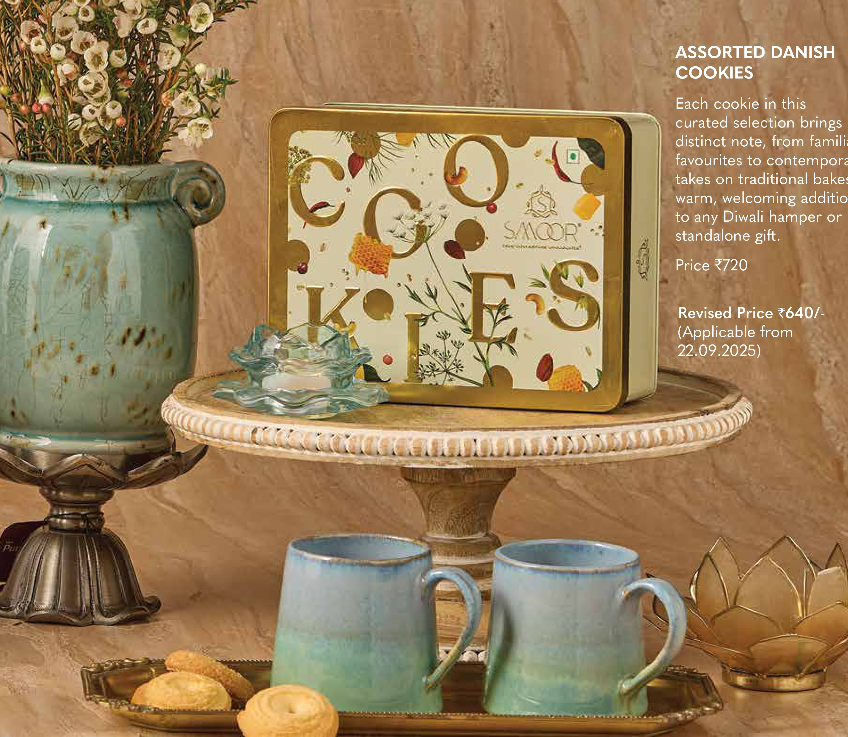 A curated selection of assorted Danish cookies, offering a delightful blend of traditional and contemporary flavors. This tin is a warm and welcoming addition to any Diwali hamper or can be a standalone gift.