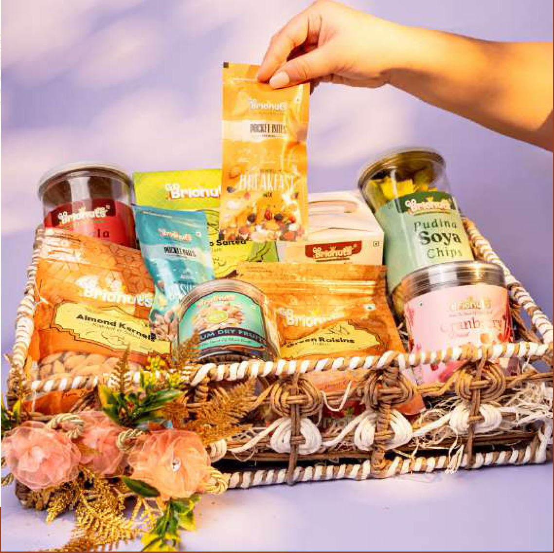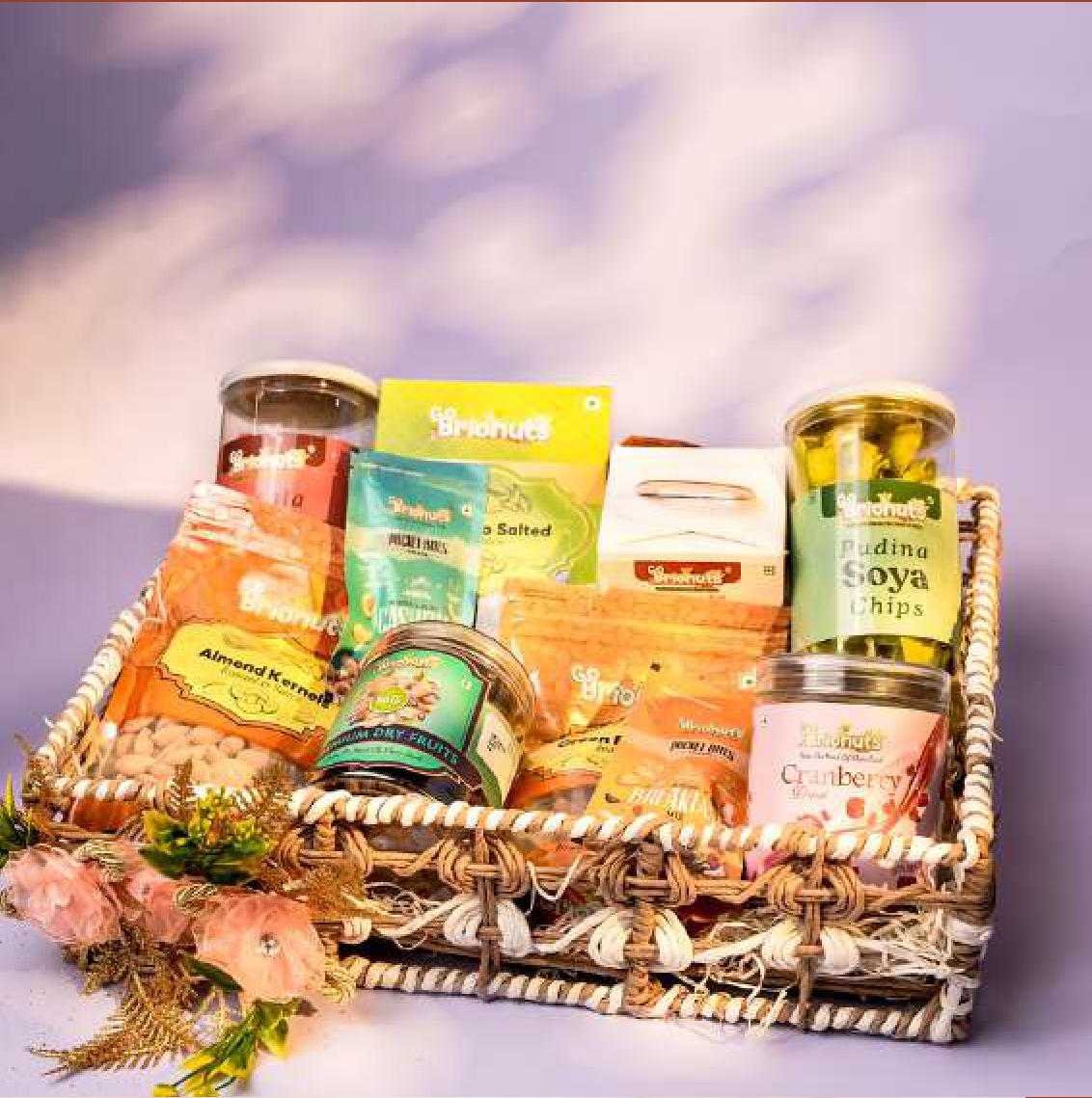 Features: Assorted snacks, Decorative basket, Includes dry fruits and nuts, Includes savory chips