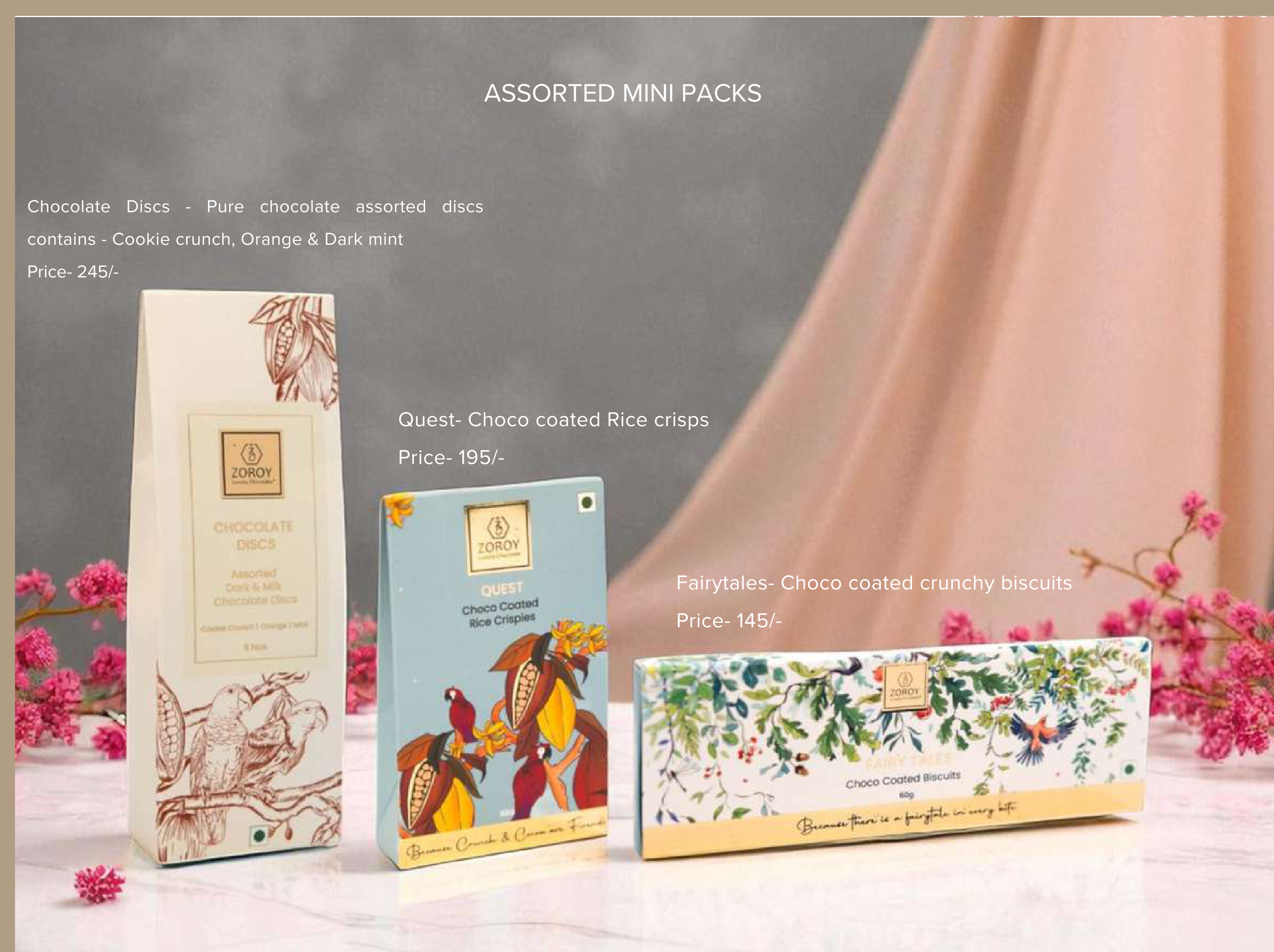 A delightful assortment of mini packs featuring pure chocolate discs in assorted flavors like cookie crunch, orange, and dark milk chocolate, alongside crunchy choco-coated rice crisps. Perfect for a sweet treat or a small gift.