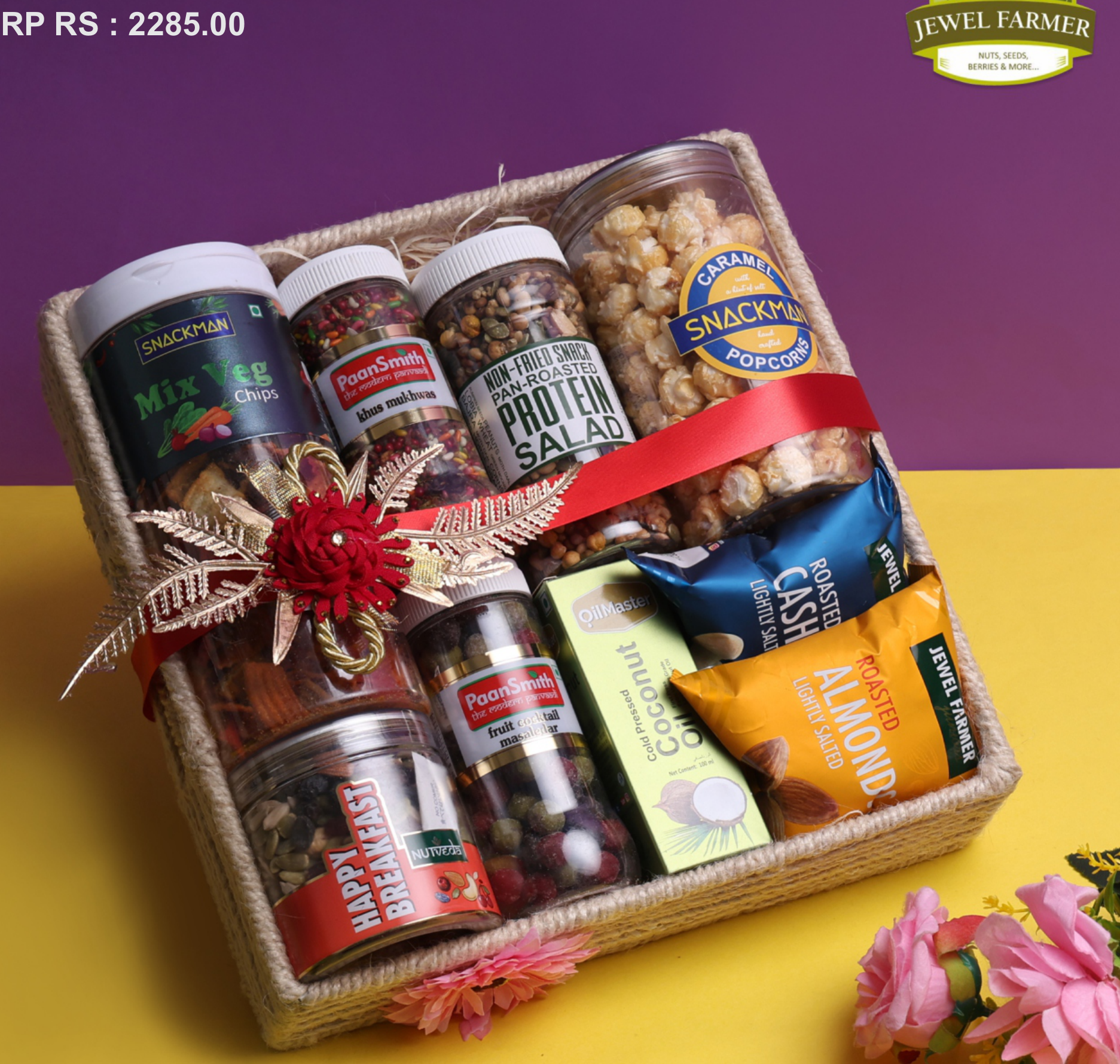 A curated gift basket filled with a variety of snacks, including chips, popcorn, protein salad, and dry fruits. It also contains assorted masalas and a bottle of cold-pressed coconut oil, making it a perfect gift for any occasion.