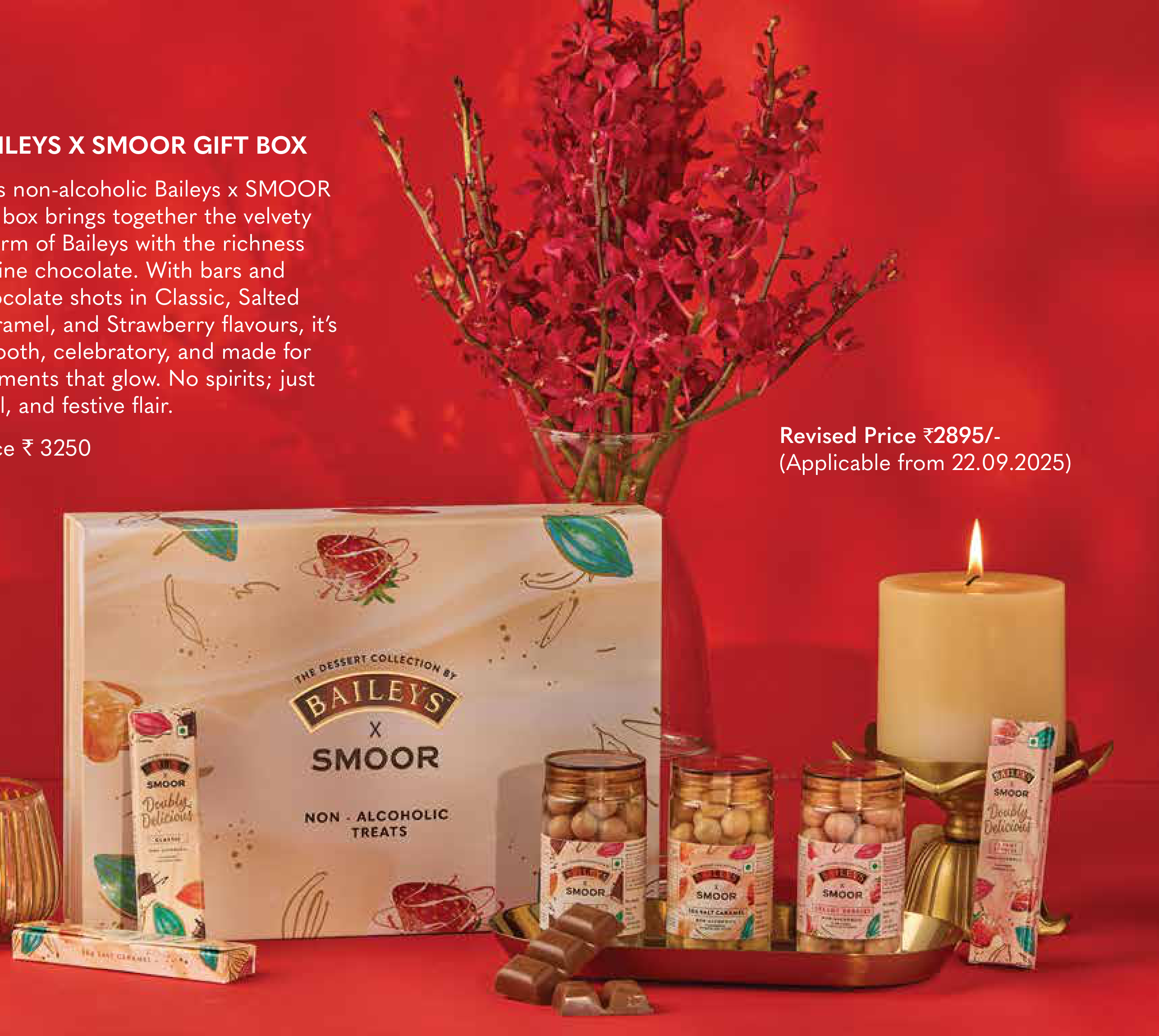 This non-alcoholic Baileys x SMOOR gift box features a velvety form of Baileys paired with rich fine chocolate. It includes bars and chocolate shots in Classic, Salted Caramel, and Strawberry flavors, perfect for celebratory moments.