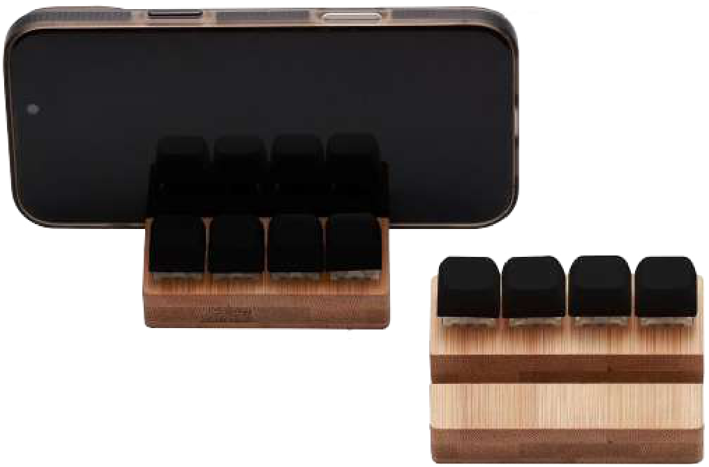 This desktop phone stand is crafted from natural bamboo with a sleek black finish. It provides a stable and convenient way to prop up your phone for hands-free viewing or video calls. Its compact design makes it ideal for any desk or workspace.