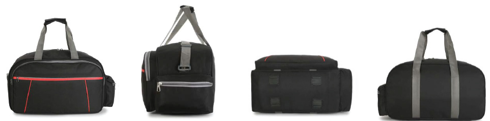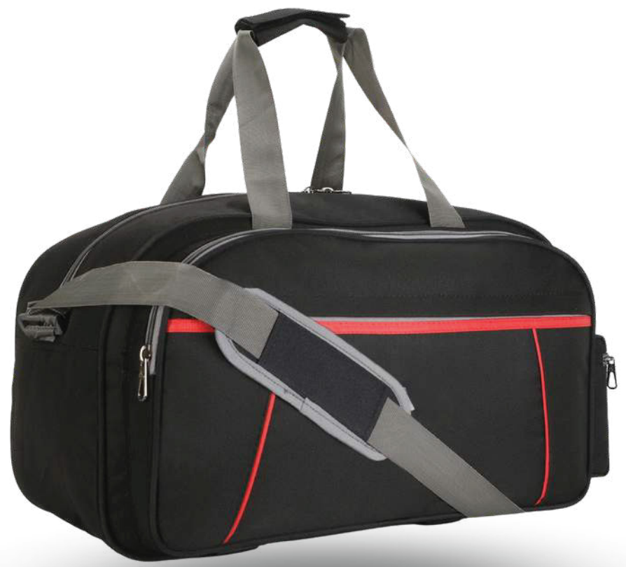 This versatile duffel bag features a durable black exterior with striking red trim accents. It offers ample space for your travel essentials and includes comfortable carrying handles and an adjustable shoulder strap for convenience.