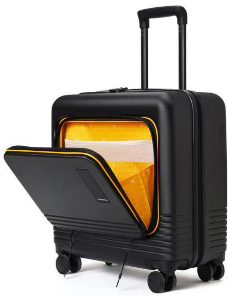 This sleek black hardshell carry-on luggage features a vibrant yellow interior for easy visibility. Its durable construction and smooth-rolling wheels make it ideal for travel. The front opening provides convenient access to your belongings.