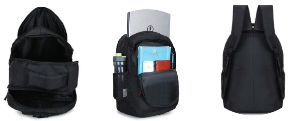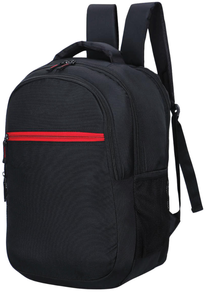 This versatile black backpack is crafted from durable polyester, featuring a striking red accent zipper on the front pocket. It offers ample storage with multiple compartments and side mesh pockets, making it ideal for daily commutes, school, or travel.