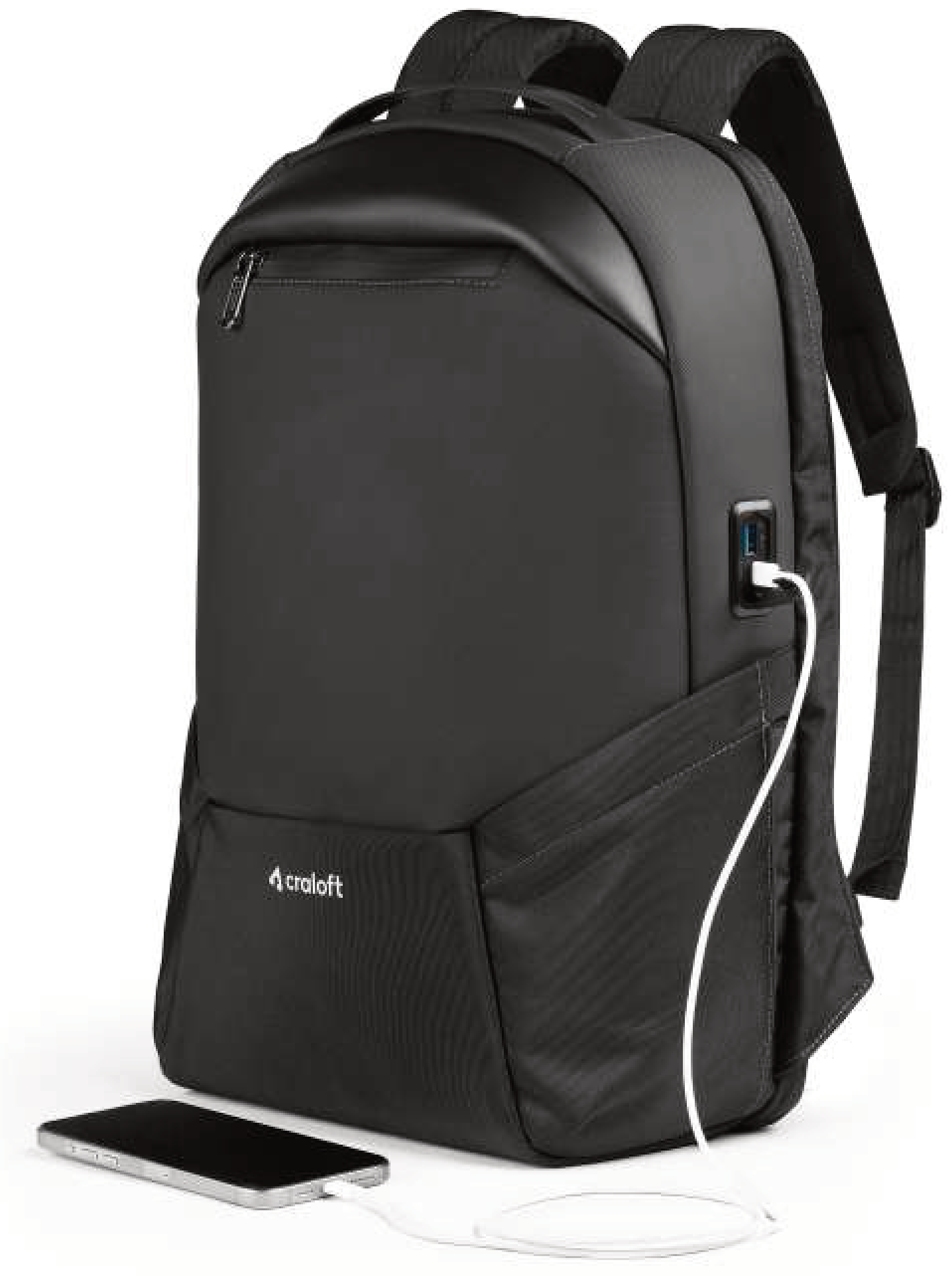 This sleek black backpack features a built-in USB charging port, allowing you to conveniently charge your devices on the go. Its durable construction and multiple compartments make it ideal for daily commutes, travel, or school.