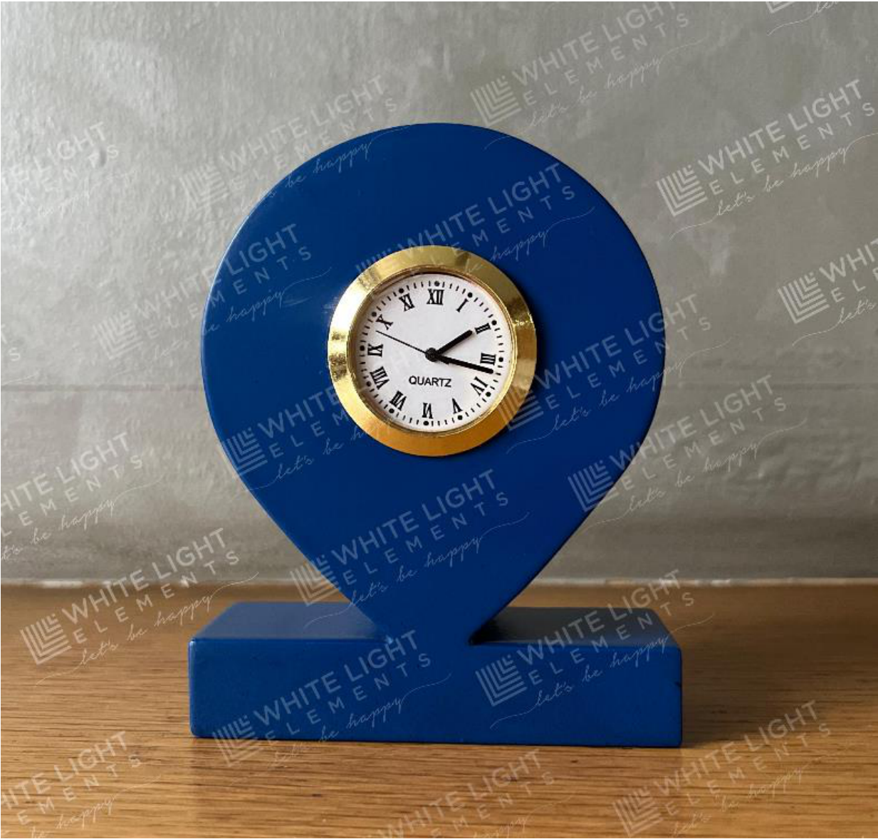 A stylish blue abstract desk clock with a classic Roman numeral face. This clock features a quartz movement for accurate timekeeping and a decorative gold-tone bezel. Its unique design makes it a great addition to any desk or tabletop.