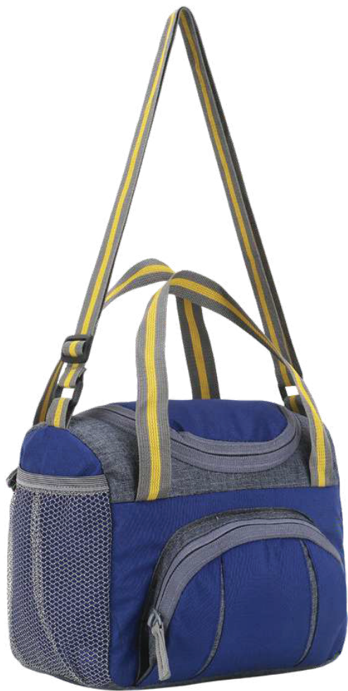 This versatile duffle bag is crafted from durable materials, featuring a combination of blue and grey fabric with striking yellow and grey striped straps. It includes multiple compartments for organized storage and a mesh side pocket for easy access to essentials.