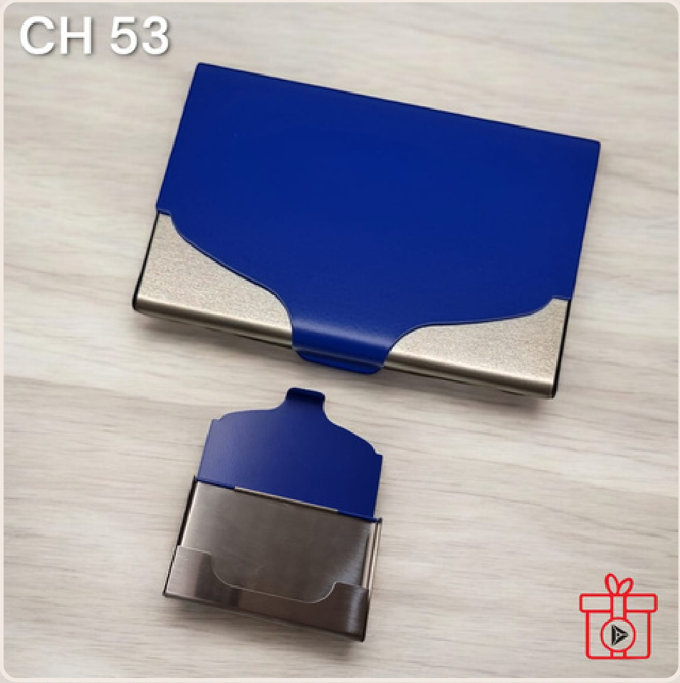 This business card holder features a sleek blue leather exterior with a durable metal frame. It is designed to keep your business cards organized and protected, making a professional impression.