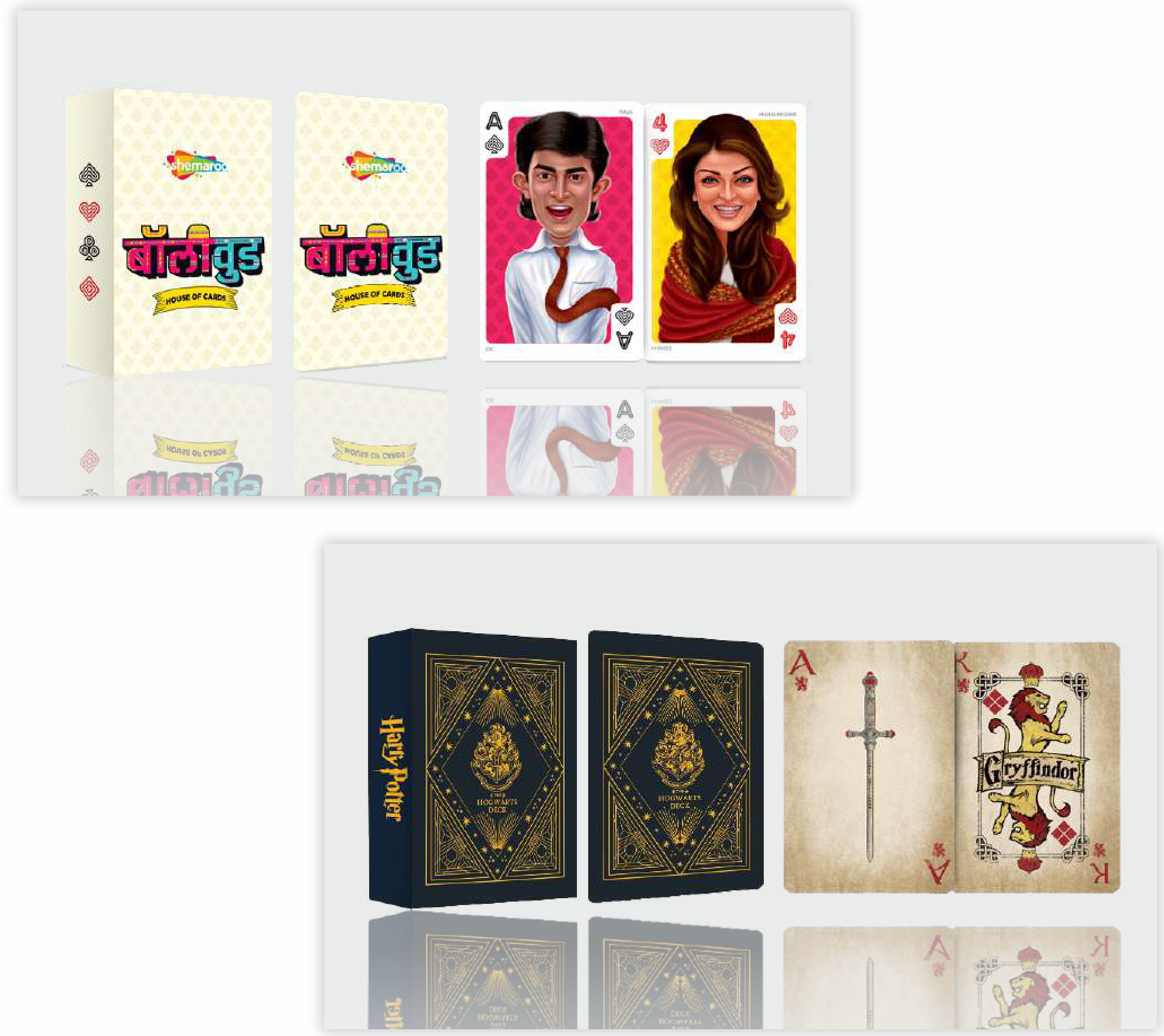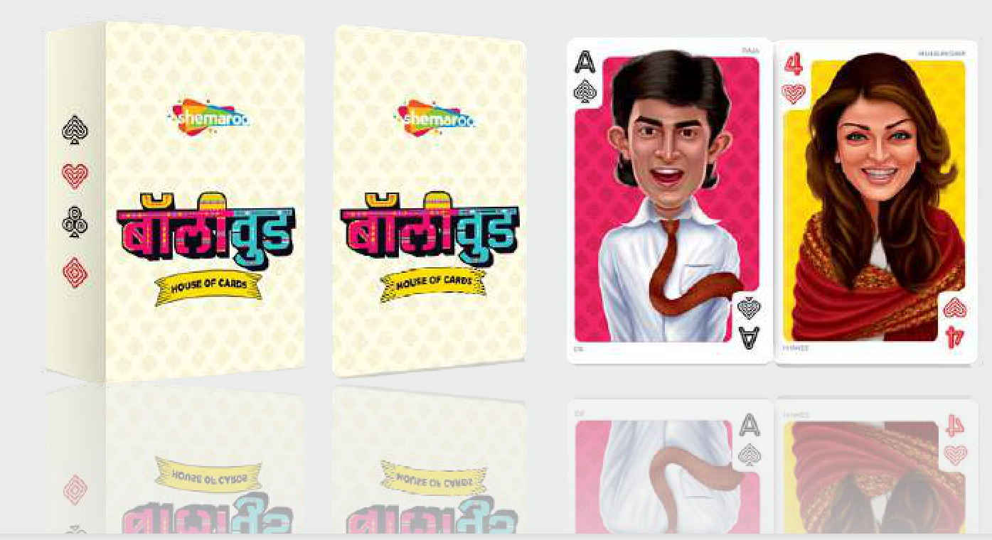 A unique deck of playing cards featuring iconic Bollywood actors and themes. This deck is perfect for game nights and for fans of Indian cinema. It includes a custom box for storage.