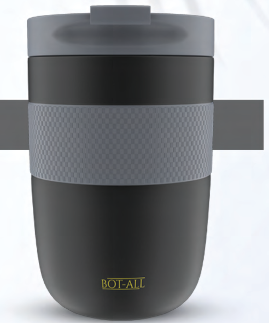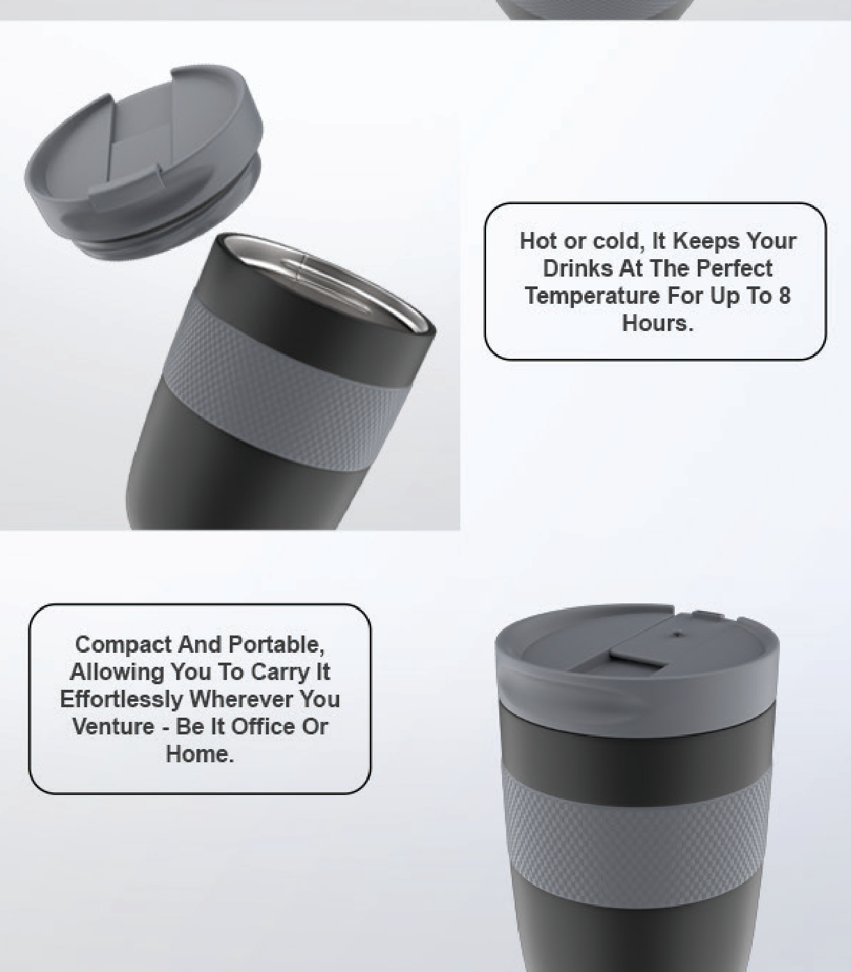 This insulated travel mug features a sleek black design with a textured grey grip for comfortable handling. The secure lid ensures no spills during your commute or travels. Perfect for keeping your beverages hot or cold on the go.