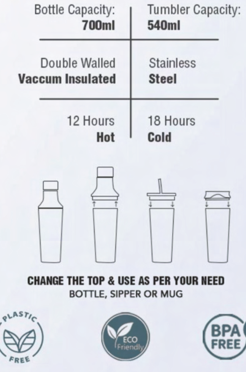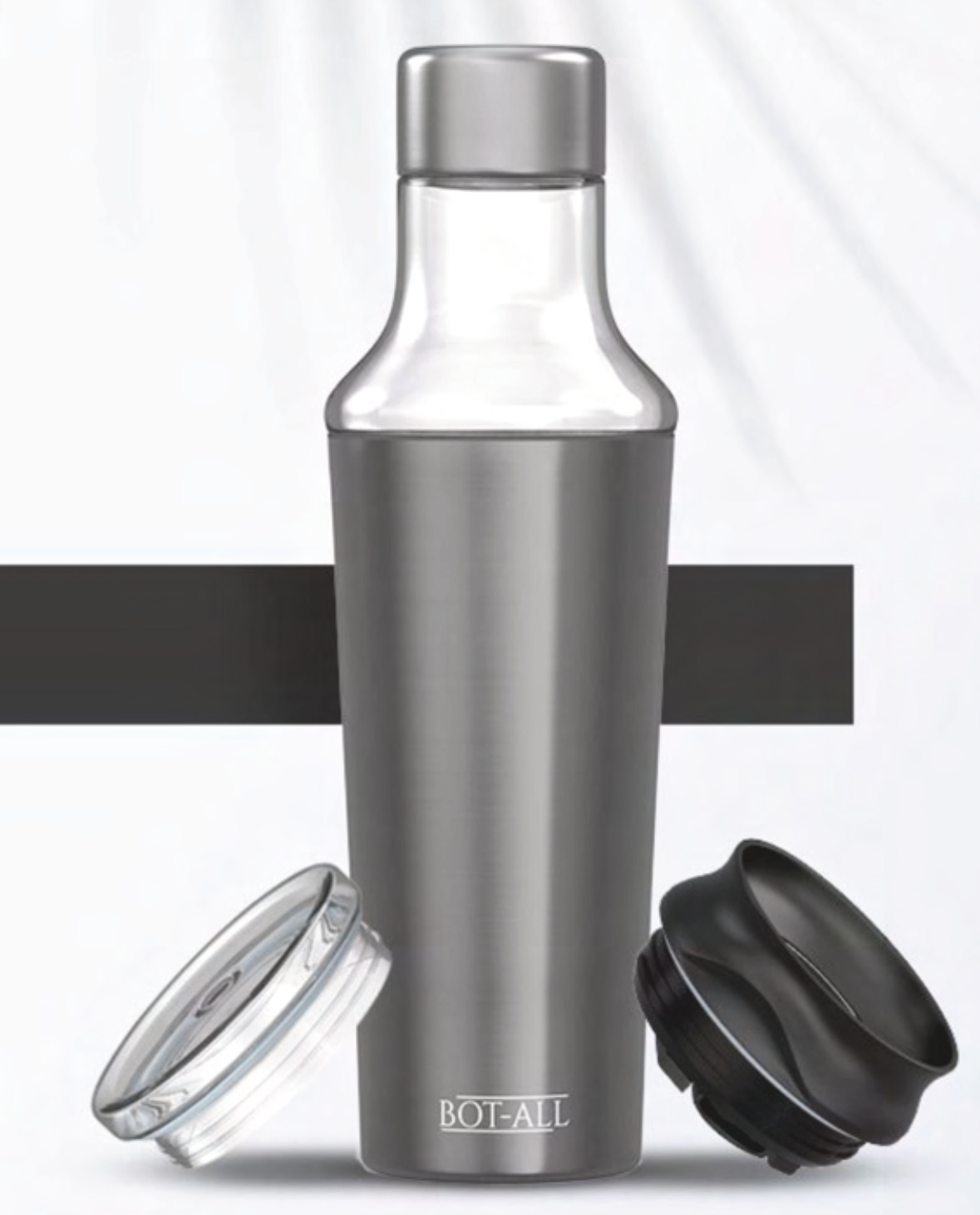 This elegant water bottle features a durable stainless steel base and a clear glass upper section, offering a sophisticated way to stay hydrated. The sleek design is complemented by two distinct cap options, one clear and one black, providing versatility for different uses. It's perfect for the modern individual who values both style and functionality in their daily accessories.
