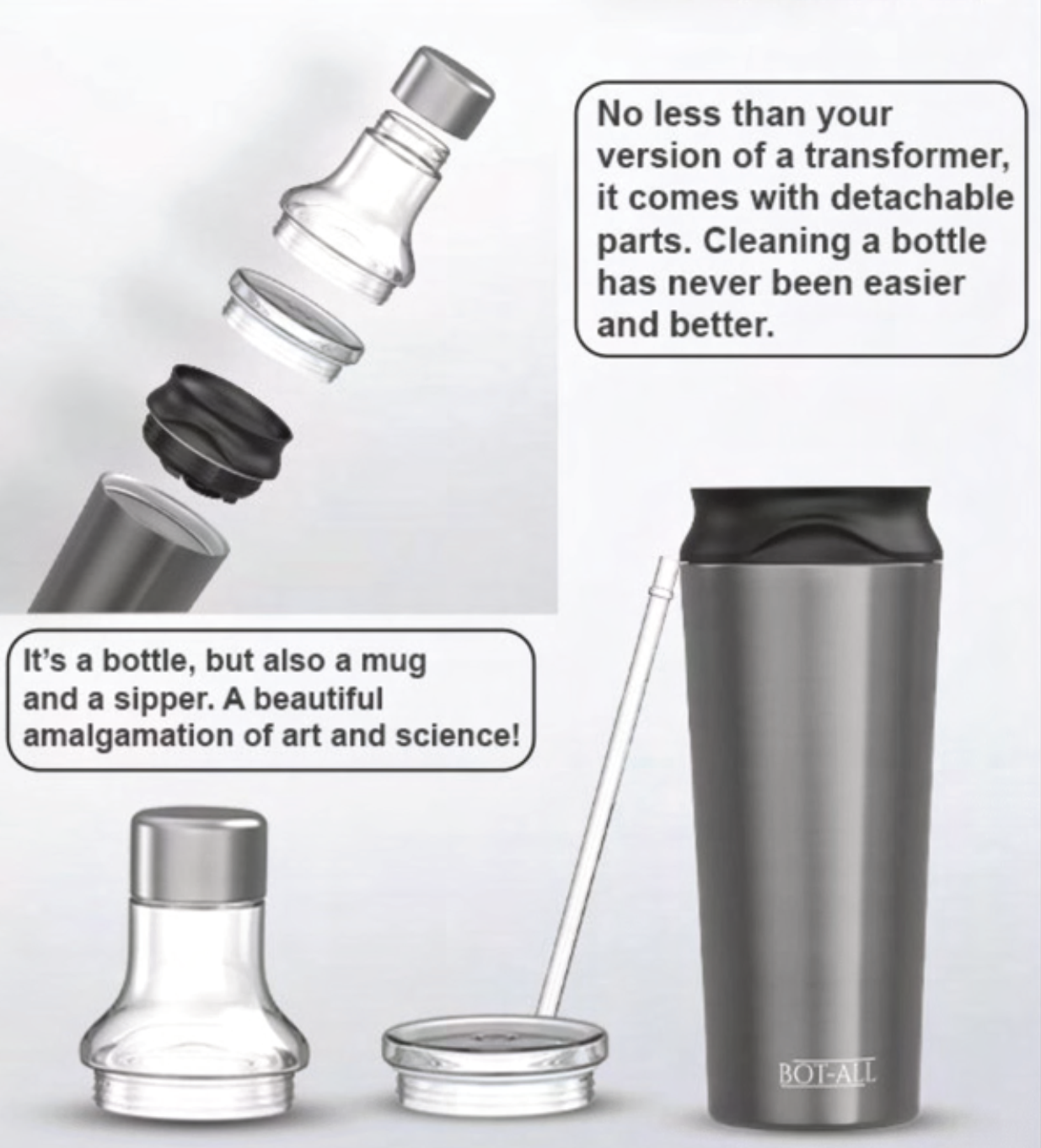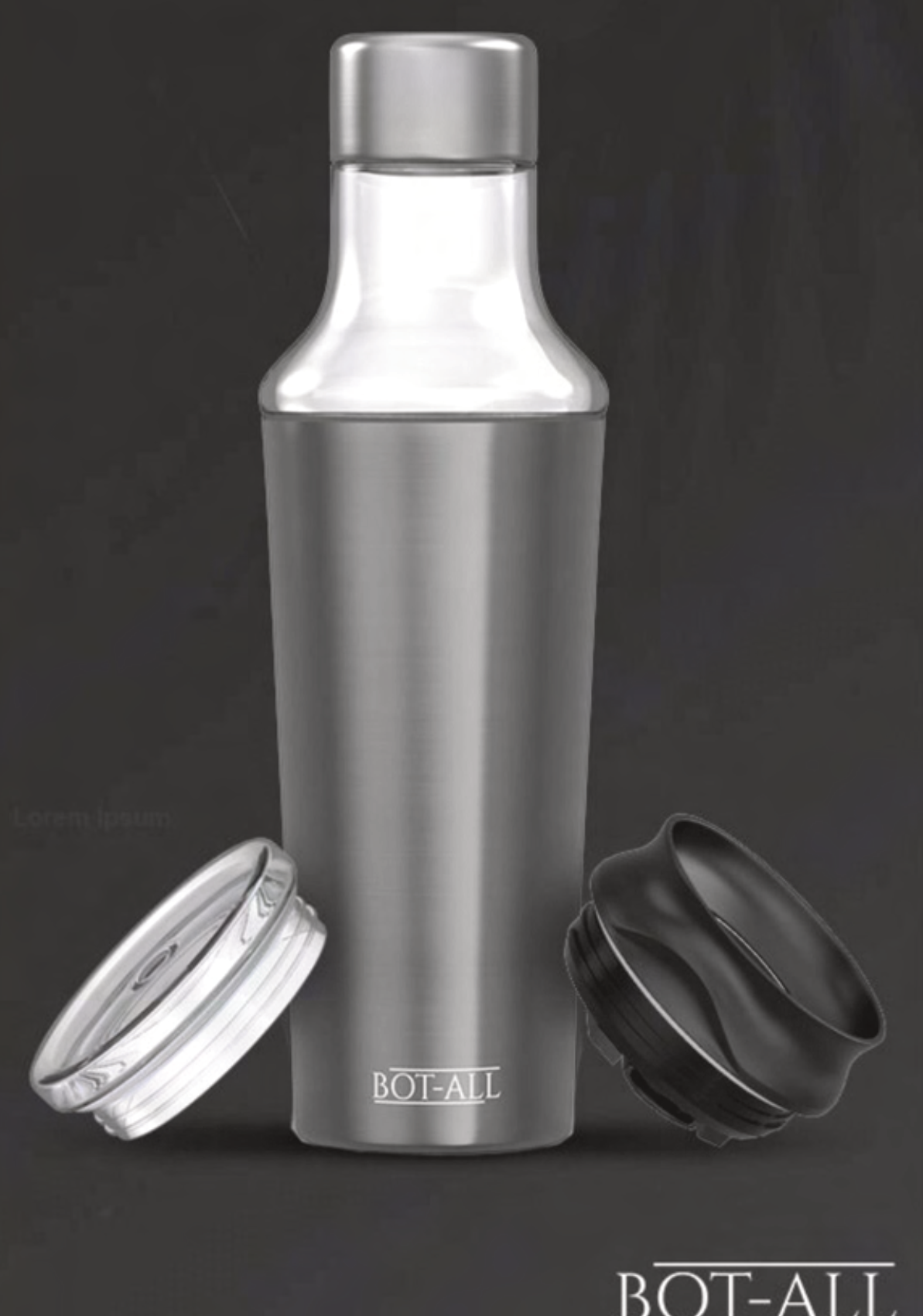 This BOT-ALL shaker bottle is crafted from durable stainless steel with a sleek, modern design. It features a secure screw-on lid and a wide mouth for easy filling and cleaning, making it ideal for protein shakes, smoothies, or any beverage on the go.