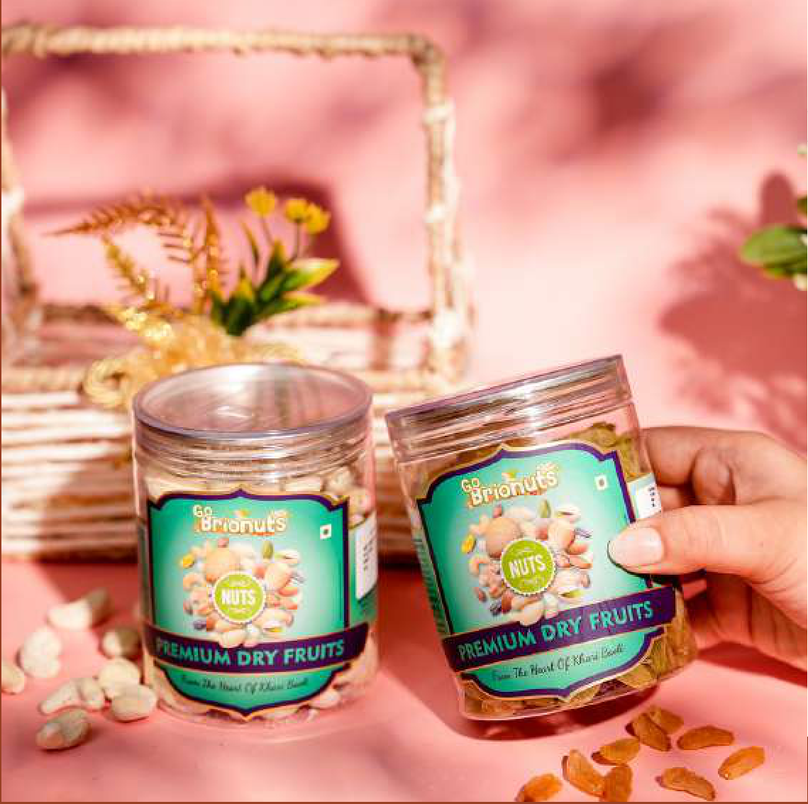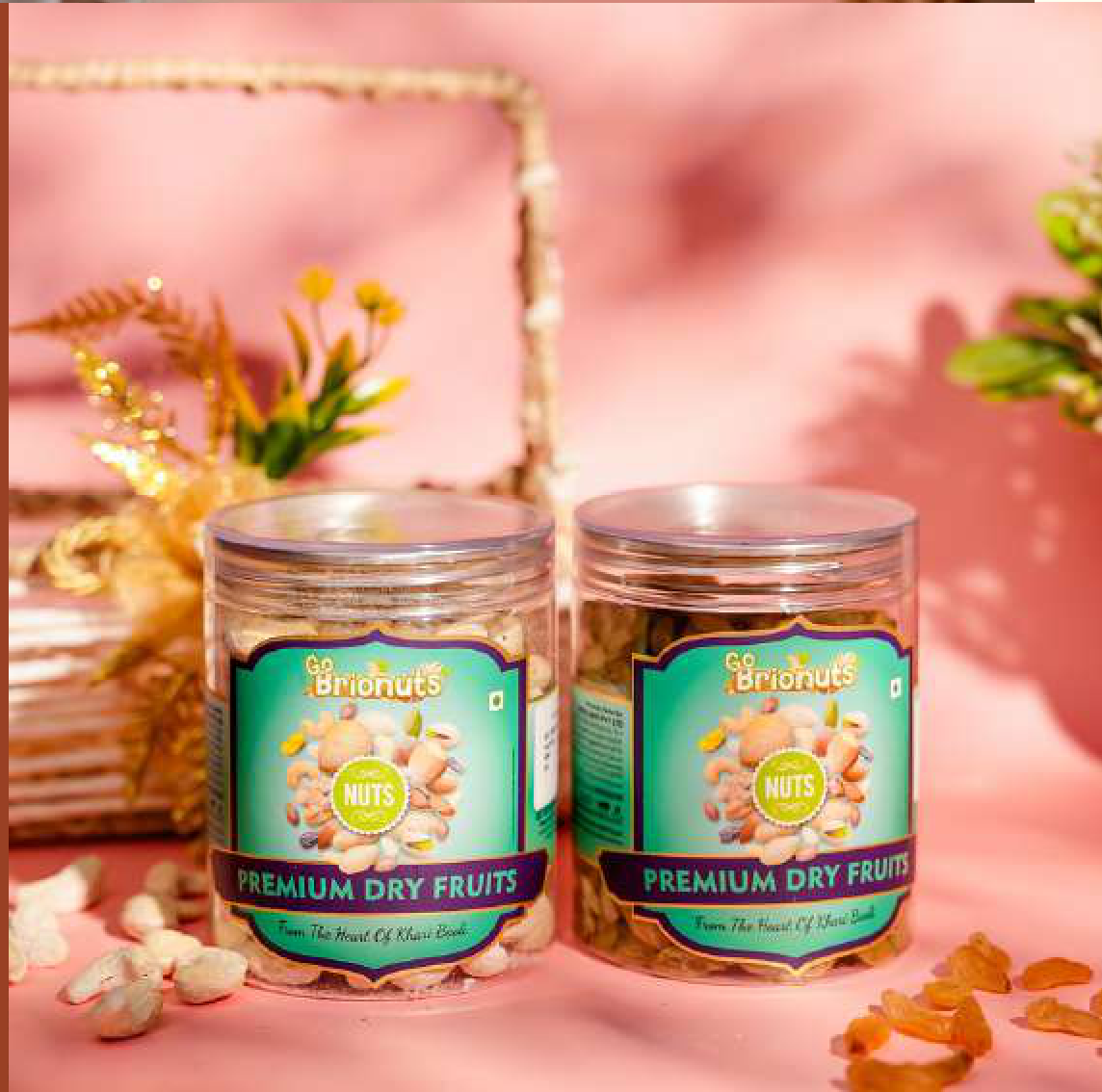 A selection of premium dry fruits presented in a convenient jar. These nuts are sourced from the heart of Khari Baoli, offering a delightful and healthy snacking option.