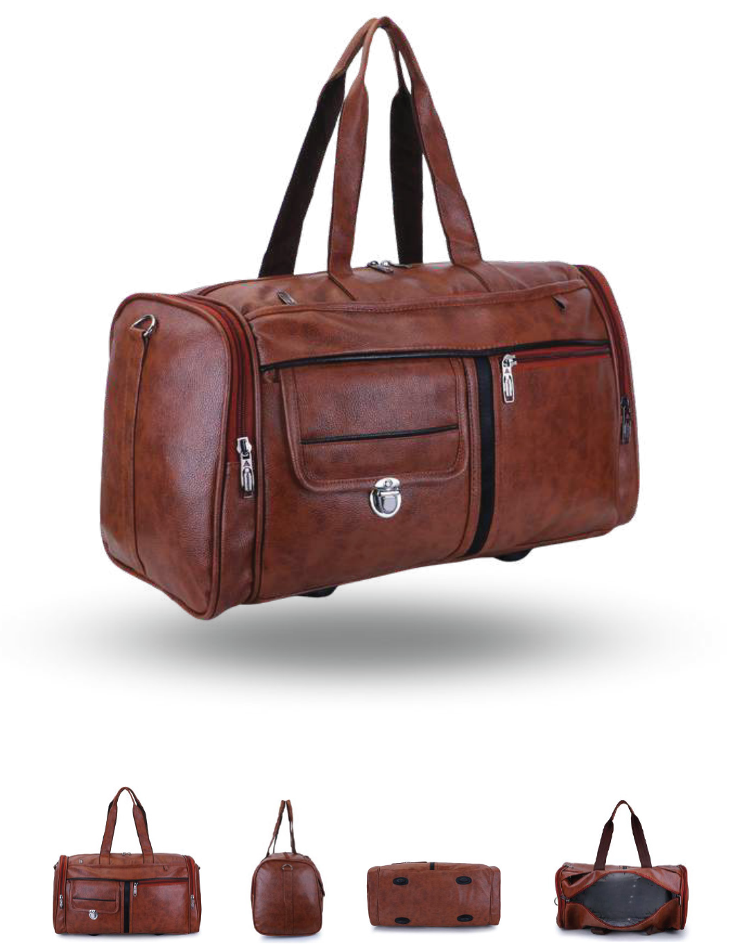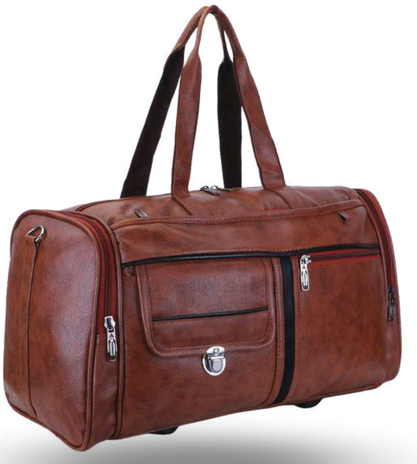 This stylish duffle bag is crafted from durable brown faux leather, offering a sophisticated look for your travels. It features multiple zippered pockets and a secure clasp closure on the front pocket, providing ample storage and easy access to your essentials.