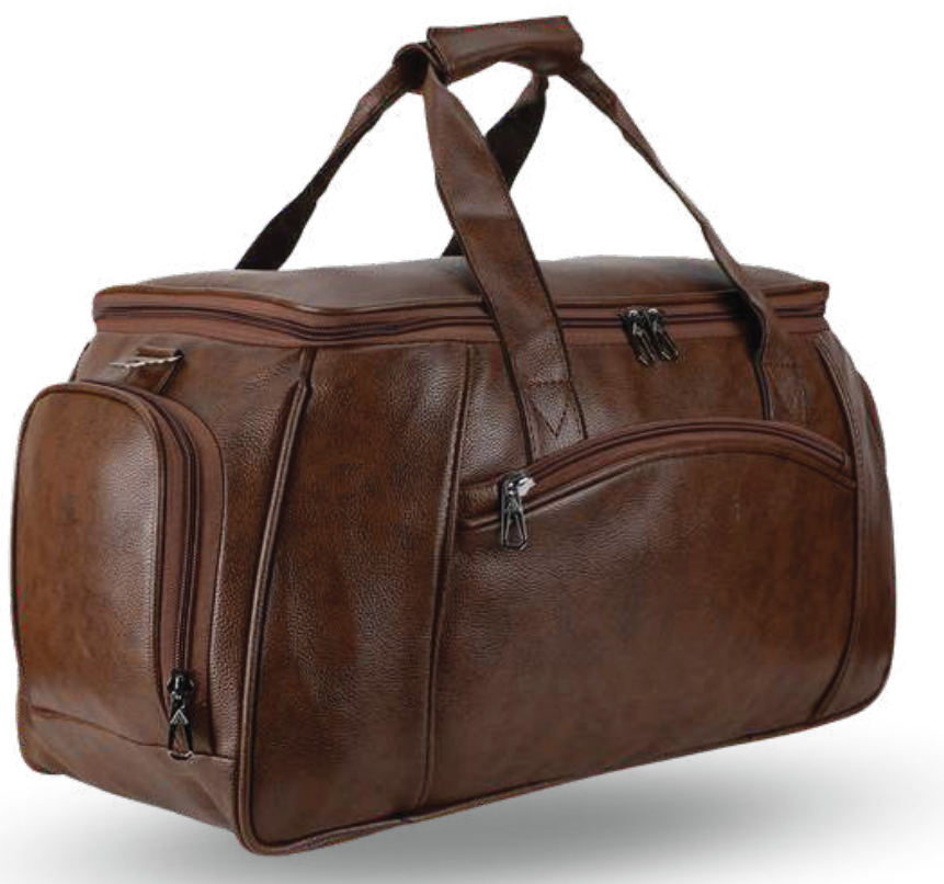 This versatile duffle bag is crafted from durable brown faux leather, offering a stylish and practical solution for travel or gym use. It features multiple zippered pockets for organized storage and comfortable carrying handles.