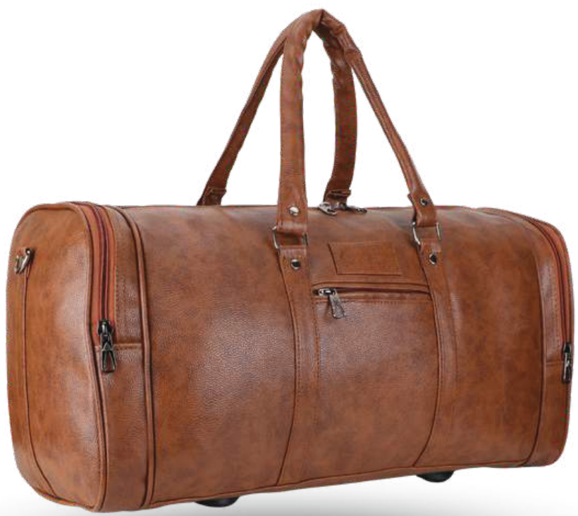 This versatile duffle bag is crafted from durable faux leather and features a spacious main compartment, perfect for weekend getaways or gym sessions. It includes convenient exterior pockets for easy access to essentials and sturdy wheels for effortless transport.