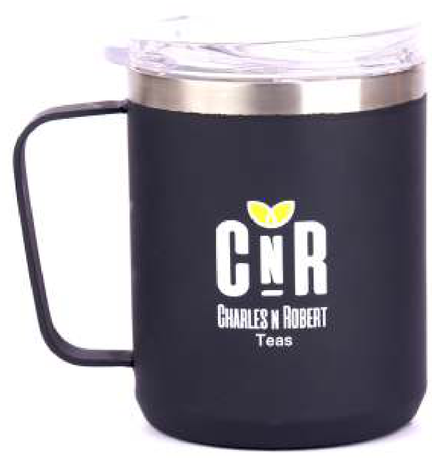 Durable insulated mug featuring the Charles N Robert Teas logo. Perfect for keeping your beverages at the desired temperature throughout the day. Its sturdy construction and comfortable handle make it an ideal companion for your daily routine.