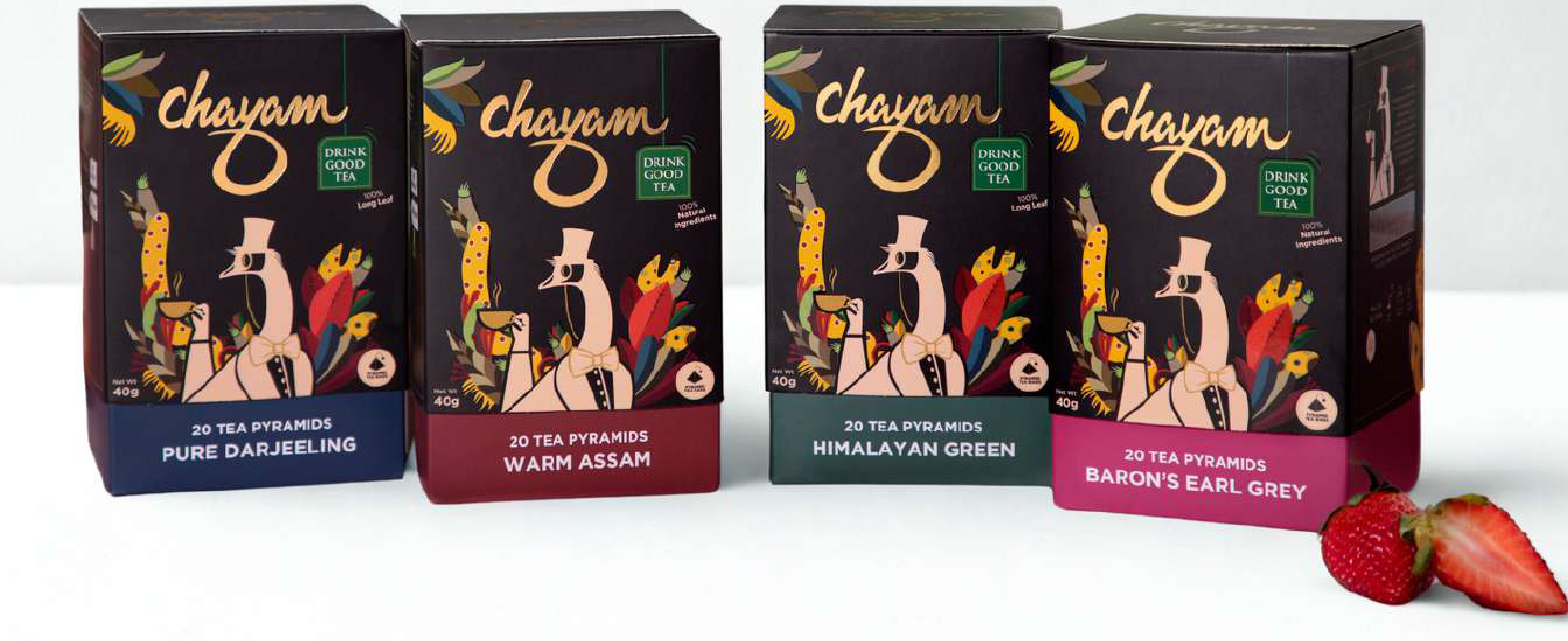 Experience a delightful range of teas with Chayam's assortment, featuring Pure Darjeeling, Warm Assam, Himalayan Green, and Baron's Earl Grey. Each box contains 20 tea pyramids made with 100% natural long leaf ingredients for a superior brew.