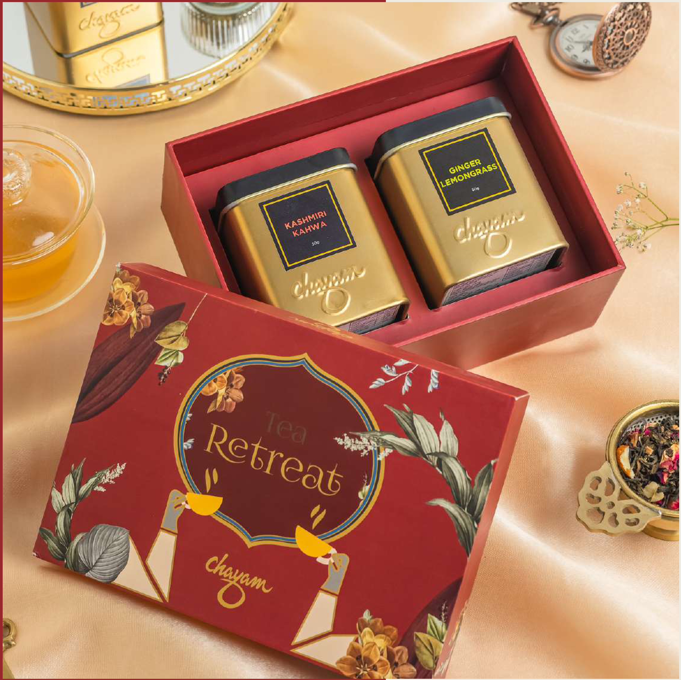 Experience a delightful tea journey with the Chayam Tea Retreat Gift Box. This exquisite set features two premium tea blends: Kashmiri Kahwa and Ginger Lemongrass, presented in elegant golden tins. Perfect for gifting or personal indulgence, it offers a sophisticated tea-drinking experience.