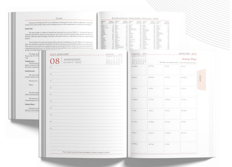 A more compact version designed for engineers on the go, this 142x220 mm diary contains 392 pages printed on 60 GSM superfine white paper. It features 64 pages of technical engineering references and a dual-colour professional layout. Its sleek cover is finished with matte lamination and Crystal UV for added durability and sophistication.