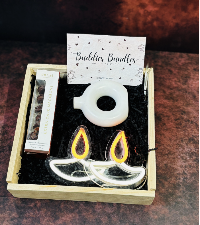 Neon diya with handmade chocolates, ceramic vase, dhoop sticks, and a celebration note in pinewood. Where tradition meets flavor.