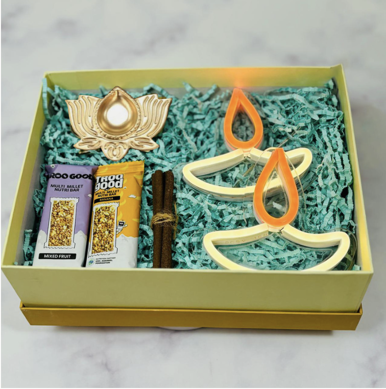 Neon diya with lotus diya, dhoop sticks, snacks, and a celebration note. A stylish and affordable delight in a rigid box.