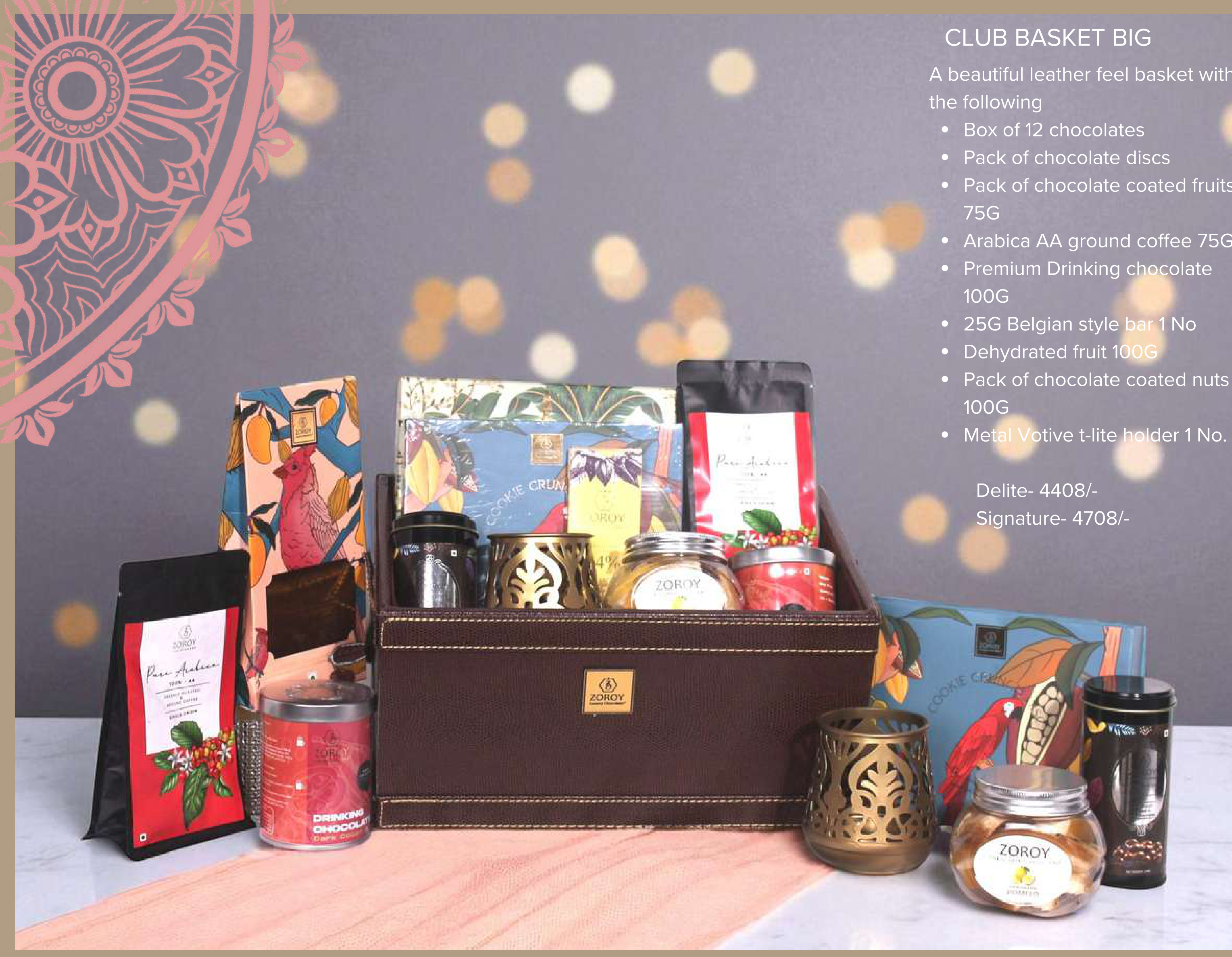 A beautifully curated gift basket featuring a leather-feel basket filled with an assortment of premium chocolates, including a box of 12 chocolates, chocolate discs, and coated fruits. It also includes Arabica AA ground coffee and a metal votive t-lite holder for an elegant touch.