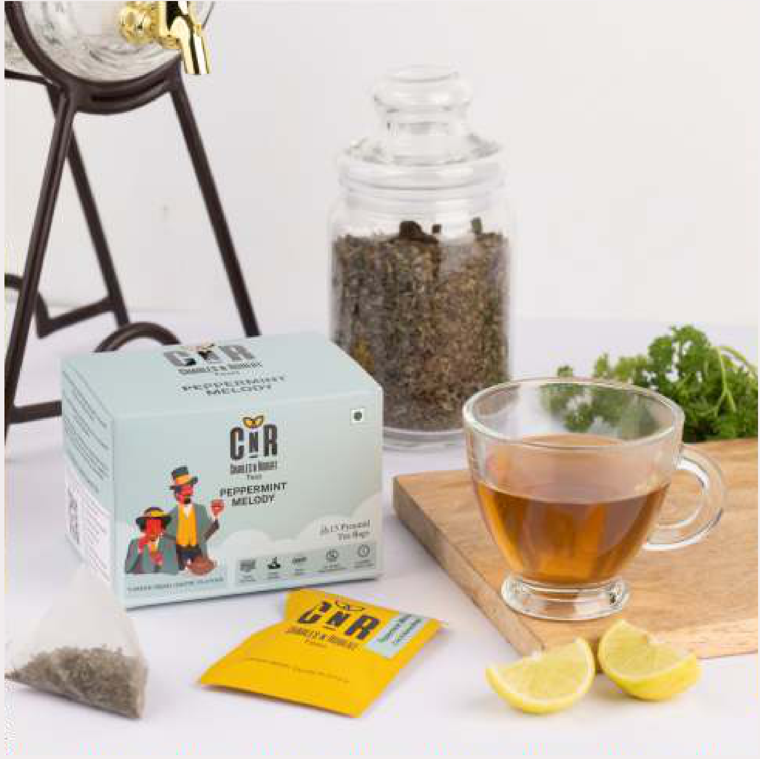 Experience the refreshing taste of Peppermint Melody tea with these convenient pyramid tea bags. Each box contains individually packaged tea bags, perfect for a quick and soothing beverage. Enjoy the invigorating aroma and flavor of premium peppermint leaves.