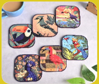 Features: Set of 4 coasters, Includes a holder, Protects surfaces, Decorative designs