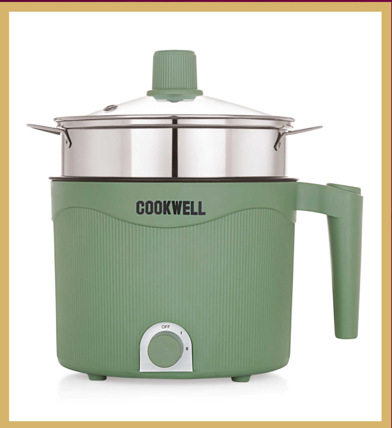 This versatile electric multi-cooker from Cookwell features a durable stainless steel steaming rack and a glass lid. Its compact design and easy-to-use controls make it ideal for various cooking tasks, from steaming to boiling.