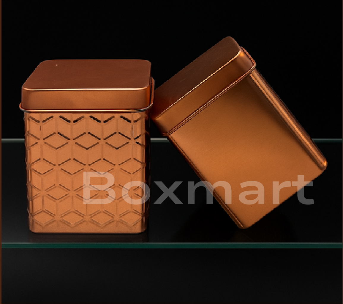 This elegant square tin container features a sophisticated copper finish with an embossed geometric pattern. Its durable construction makes it ideal for storing various items, adding a touch of refined style to any space.