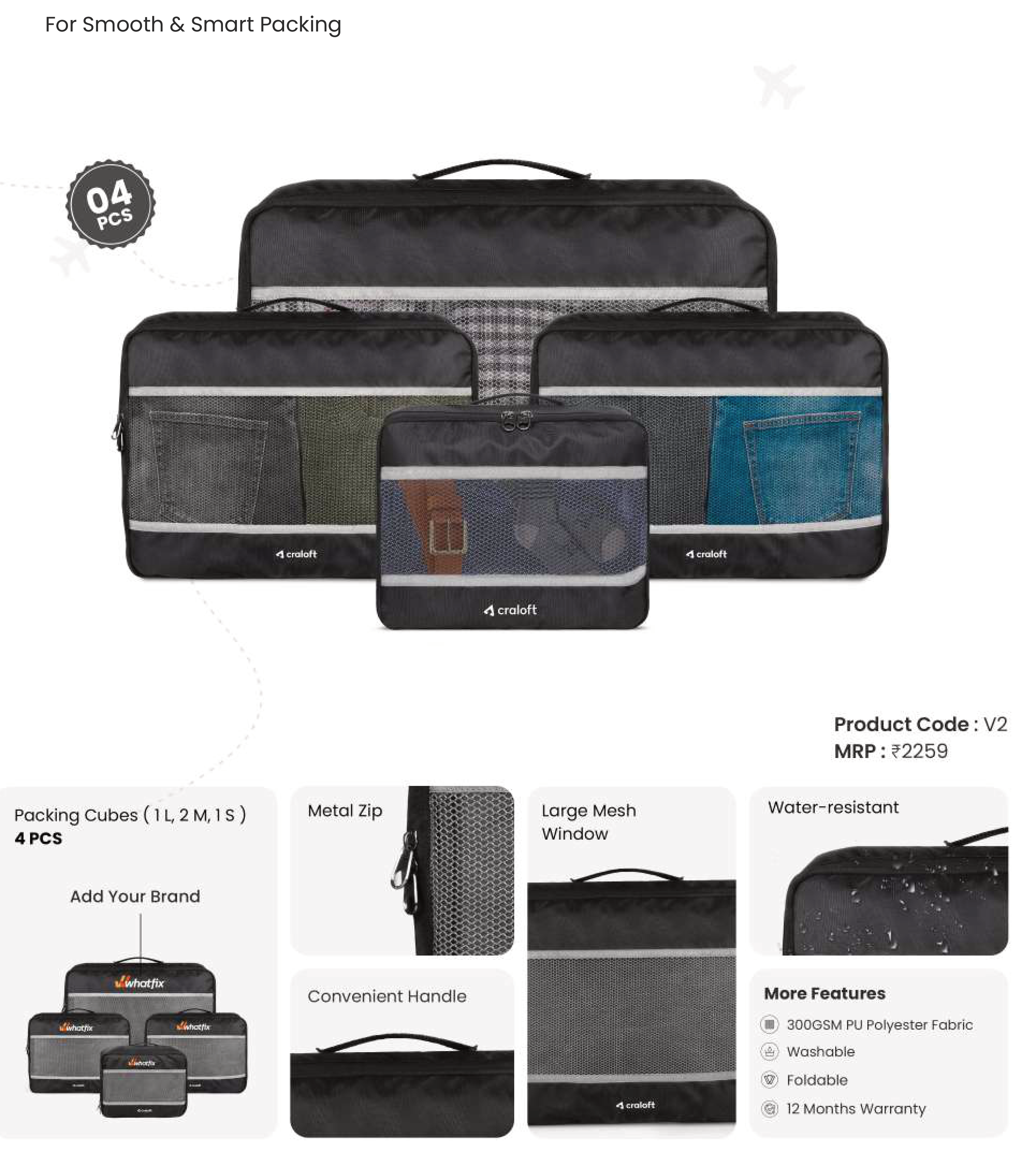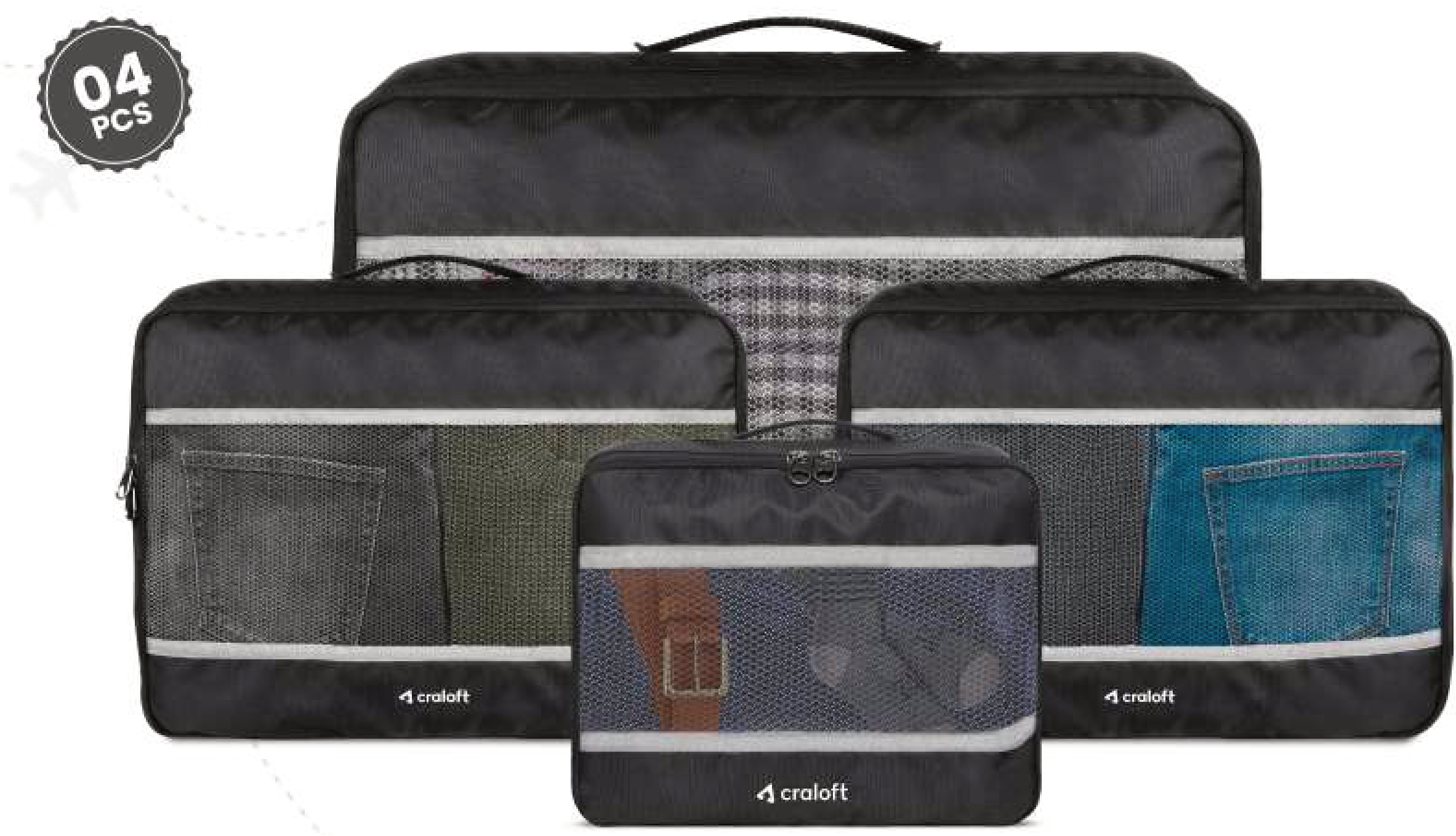 Organize your luggage efficiently with this 4-piece set of Craloft packing cubes. Designed for durability and convenience, these cubes feature mesh fronts for easy visibility of contents and sturdy zippers for secure closure. Perfect for keeping clothes, accessories, and toiletries neatly sorted during travel.