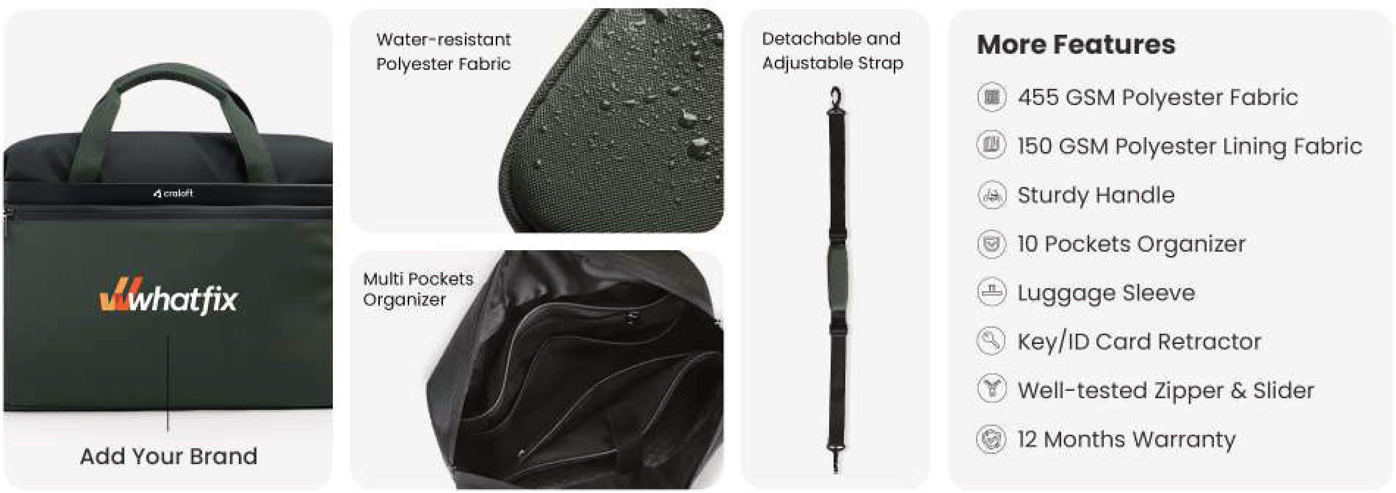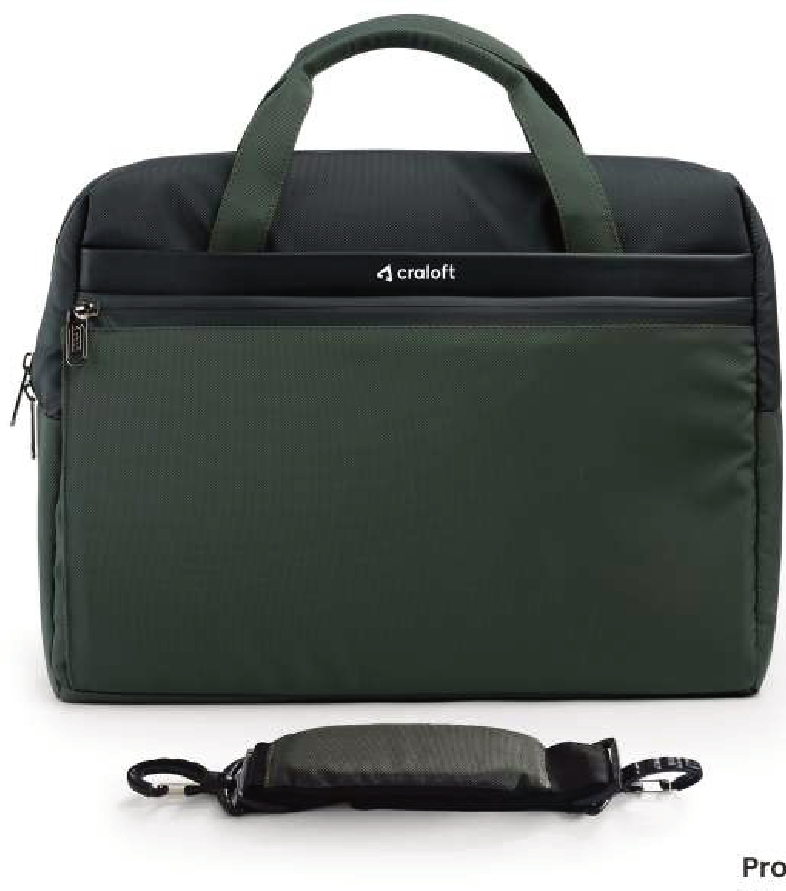 This versatile laptop bag from Craloft features a durable dark green exterior with a convenient front zippered pocket. It includes a detachable, padded shoulder strap for comfortable carrying and a professional look.