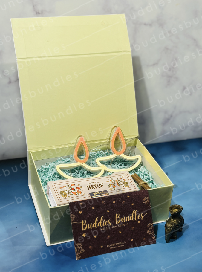 A neon diya hamper with premium sweets, dhoop sticks, and a celebration note in a custom rigid box. Personalized for branding impact.