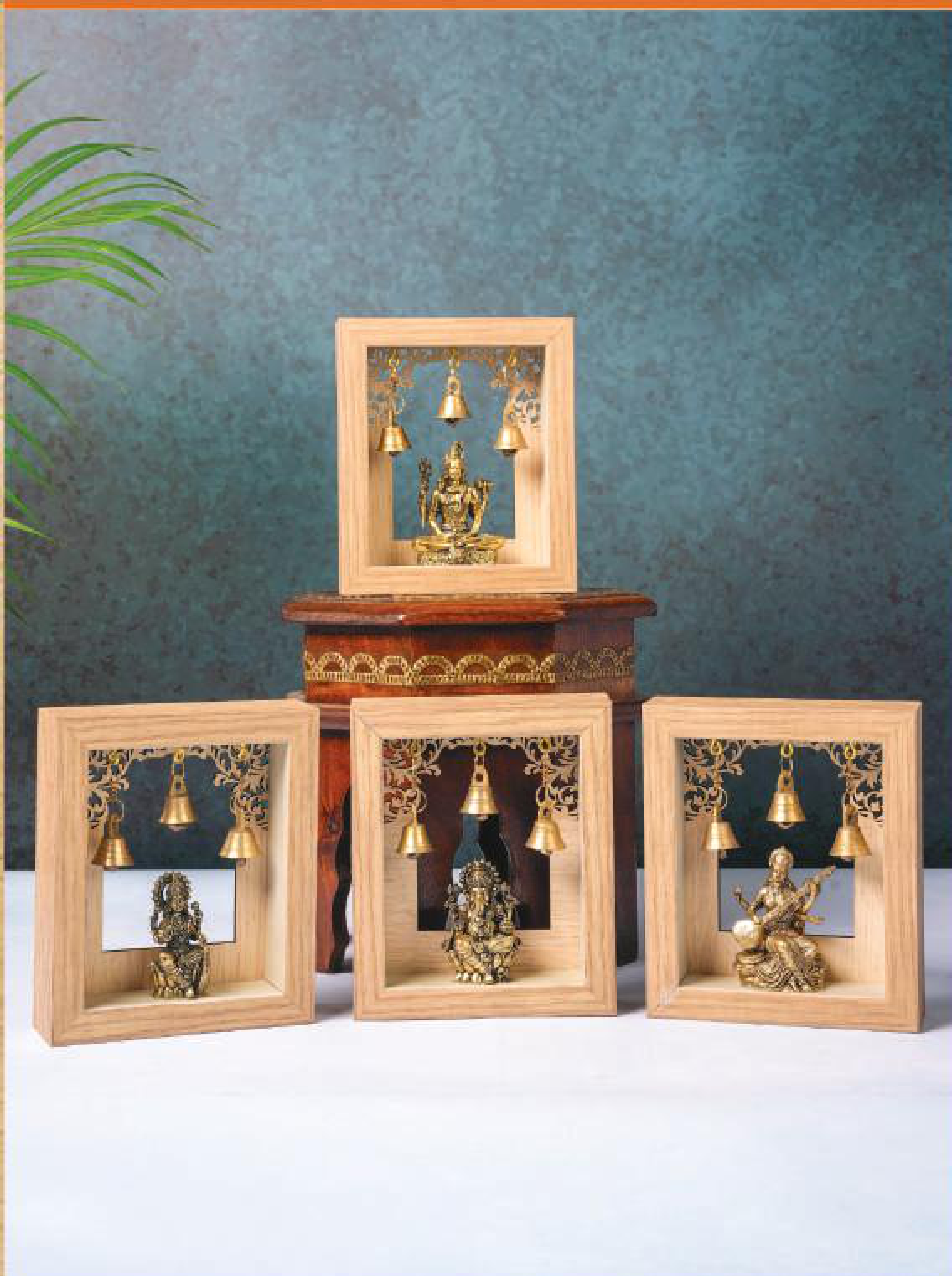 Decorative Wooden Frame with Brass Deity Idols and Bells