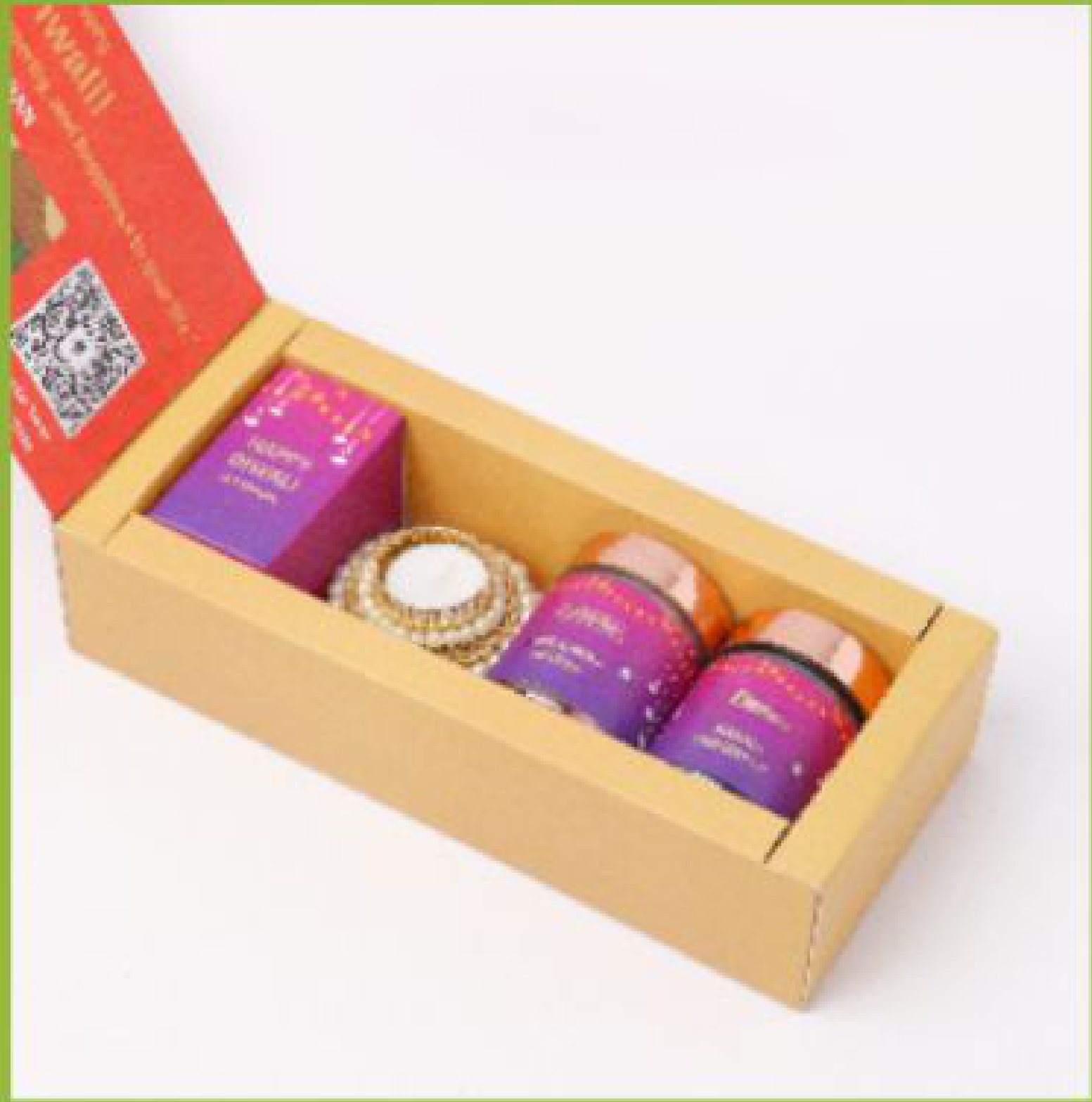 Celebrate Diwali with this beautifully curated gift box. It includes two scented candles in decorative jars and an elegant tealight holder, perfect for creating a festive ambiance. This set makes a thoughtful present for loved ones during the festival of lights.