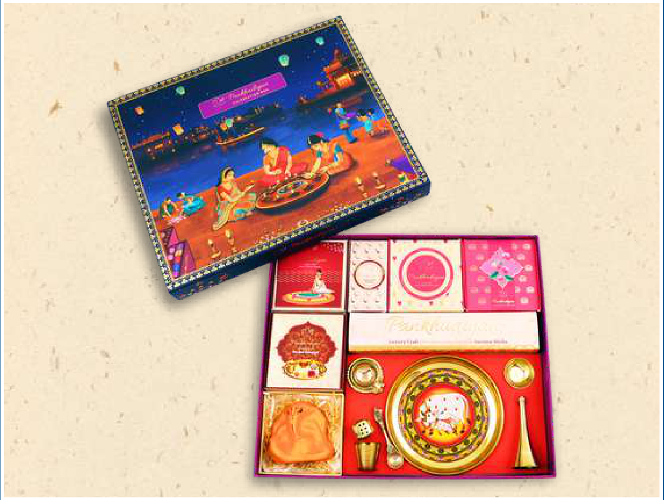 This exquisite Diwali gift box is designed to bring joy and festivity. It features a beautifully illustrated lid depicting a traditional Indian celebration, and the interior holds a decorative plate, small brass accessories, and assorted sweets or dry fruits, making it a perfect present for loved ones.