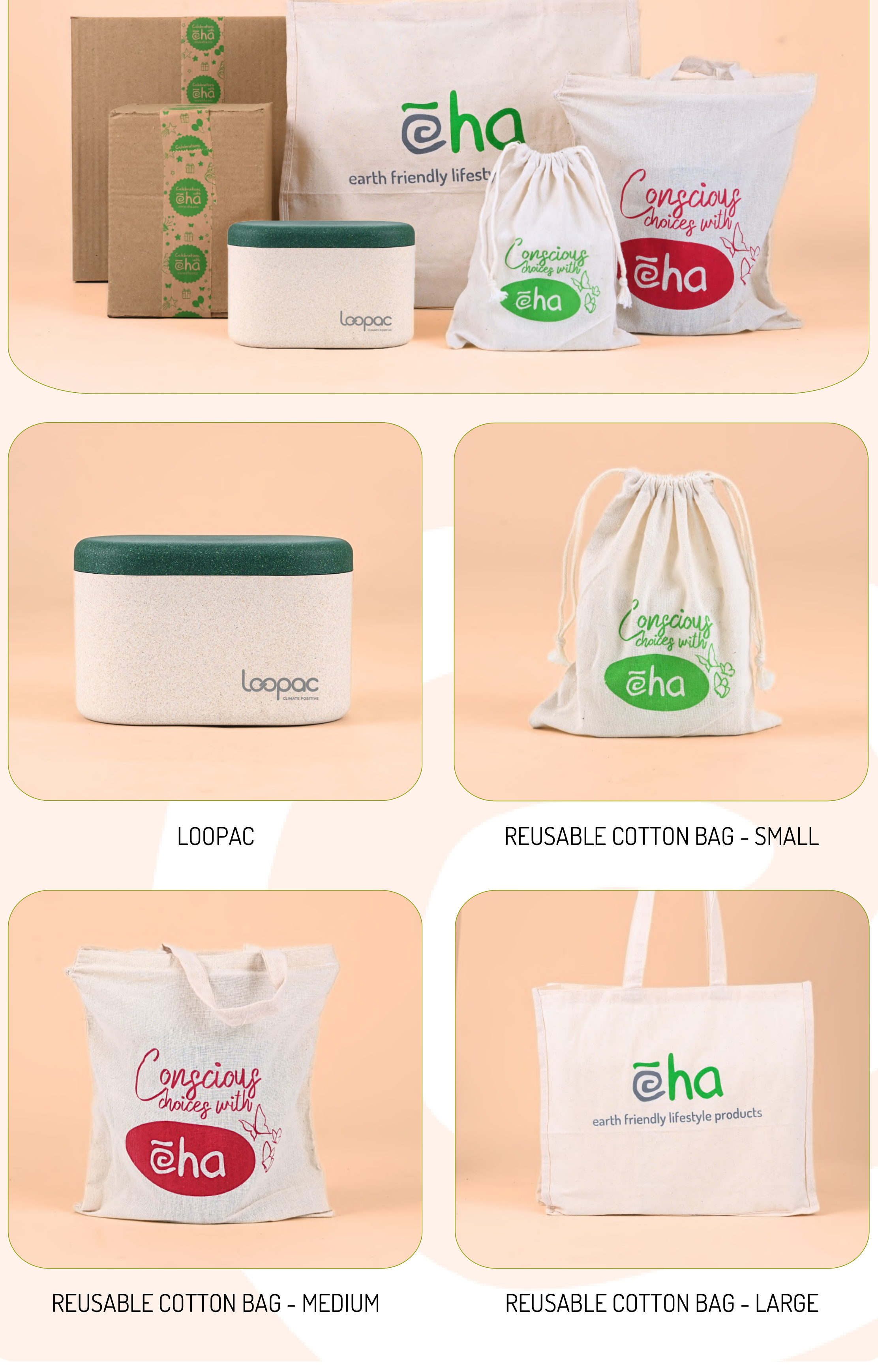 This collection features a set of reusable cotton bags in various sizes (small, medium, and large) and a Loopac container. The bags are designed with the slogan 'Conscious choices with Eha' and 'earth friendly lifestyle products', promoting sustainability. The Loopac container is ideal for storing food or other items, contributing to an eco-conscious lifestyle.