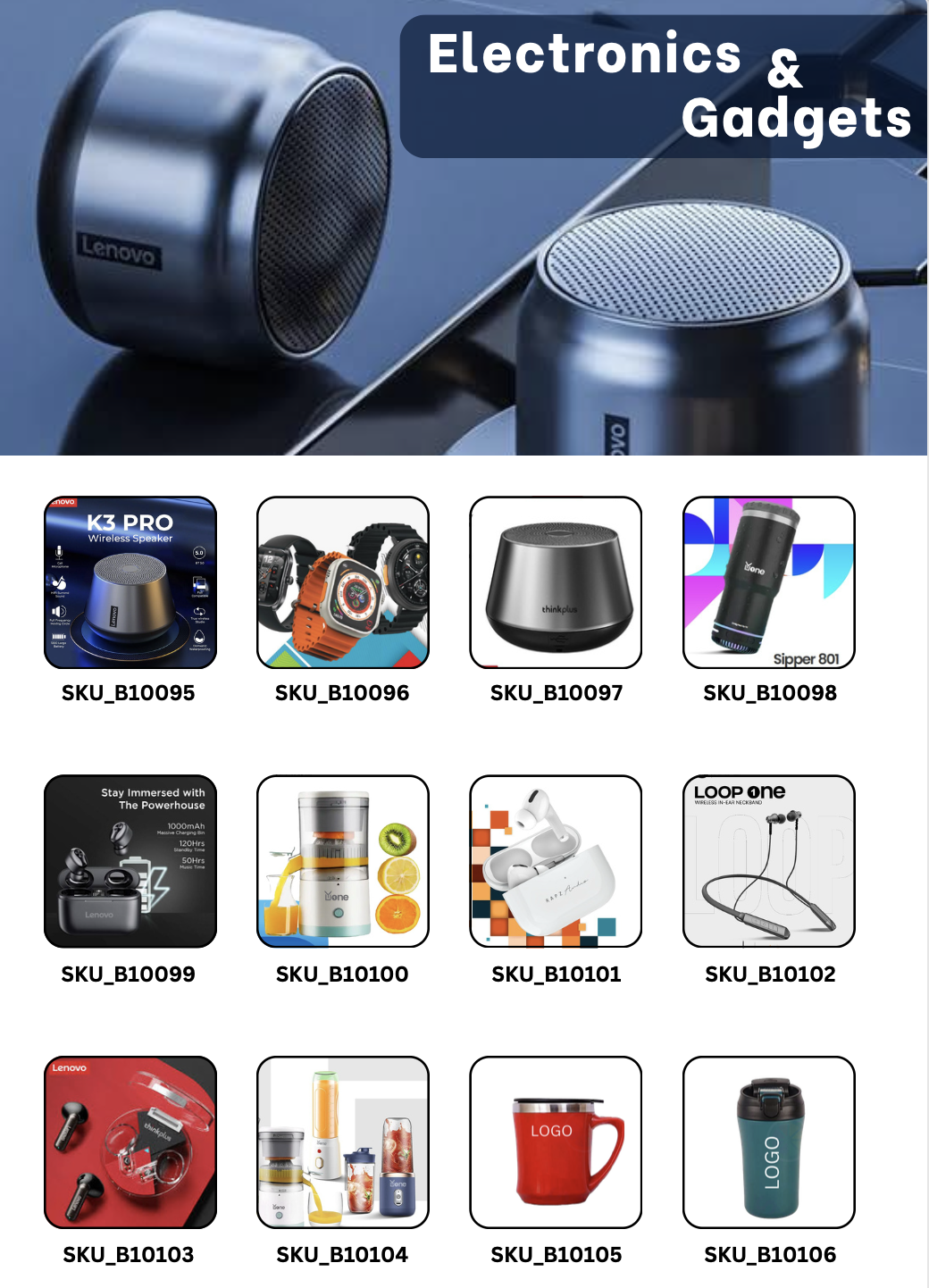 Stay ahead with our dynamic range of electronics and gadgets — from wireless speakers, smartwatches, and earbuds to portable blenders and tech-friendly drinkware. Designed for modern lifestyles, each product blends innovation, functionality, and sleek design, making them perfect for personal use or impactful corporate gifting.