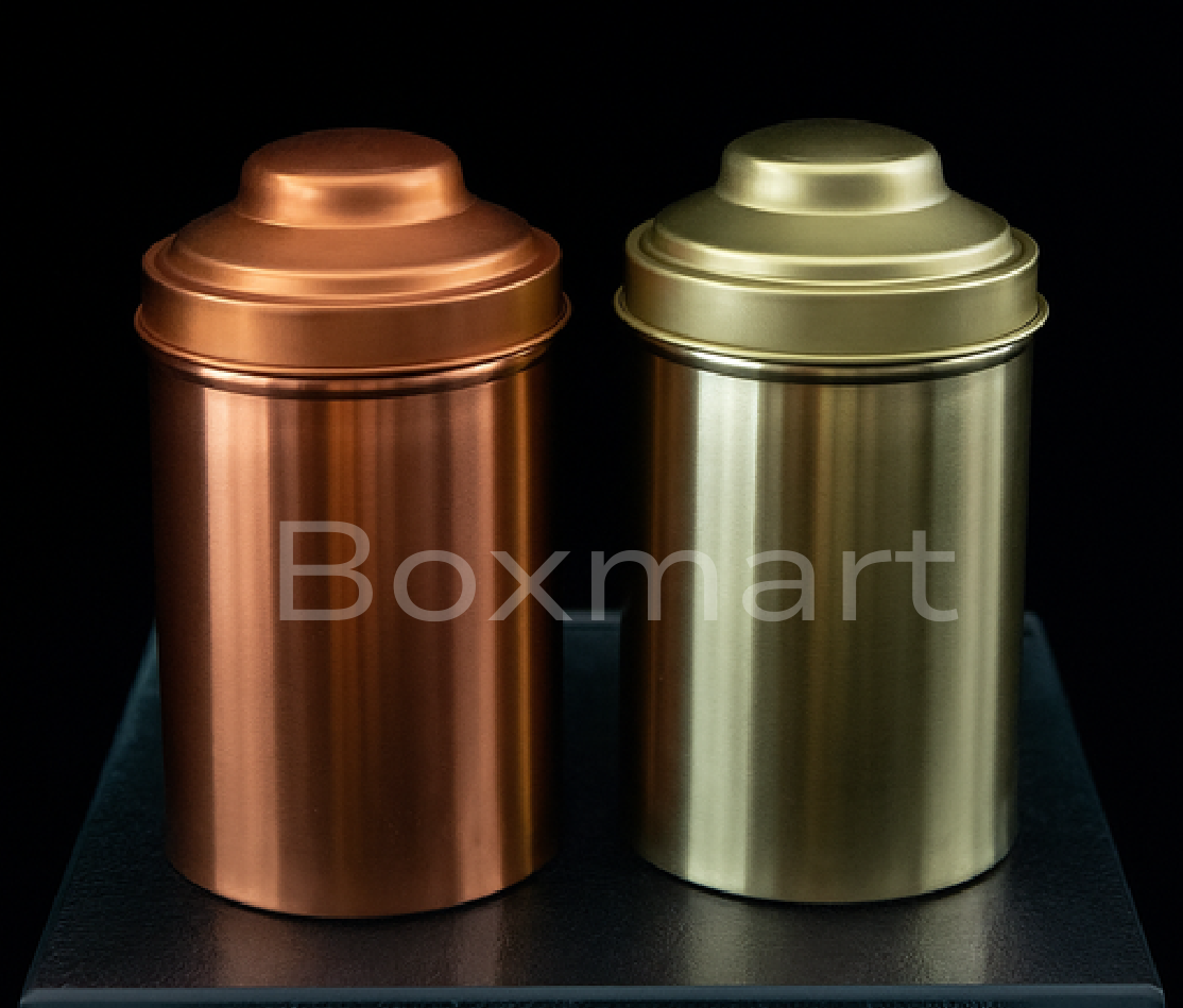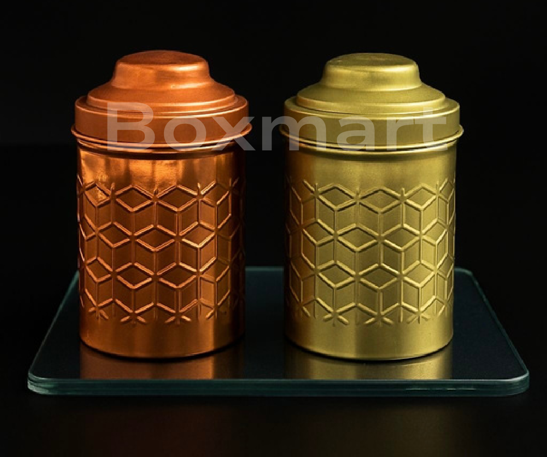 A set of two decorative metal canisters featuring an intricate embossed geometric pattern. These versatile containers are perfect for storing dry goods, spices, or small kitchen items, adding a touch of elegance to your countertop.