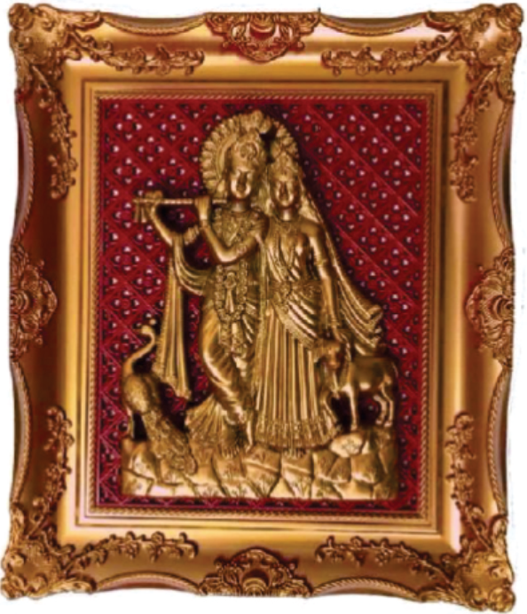 Exquisite wall art featuring an embossed depiction of Radha and Krishna in a rich gold finish. The intricate detailing and ornate frame make this piece a stunning addition to any home, perfect for adding a touch of divine elegance and cultural richness.