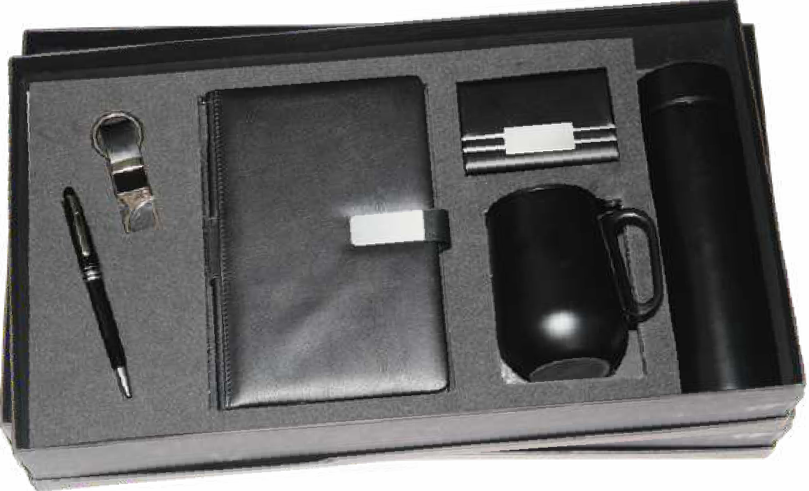 This sophisticated executive gift set includes a sleek black pen, a stylish keychain, a durable notebook, a professional card holder, and a classic mug. Crafted with quality materials, it's perfect for corporate gifting or personal use.